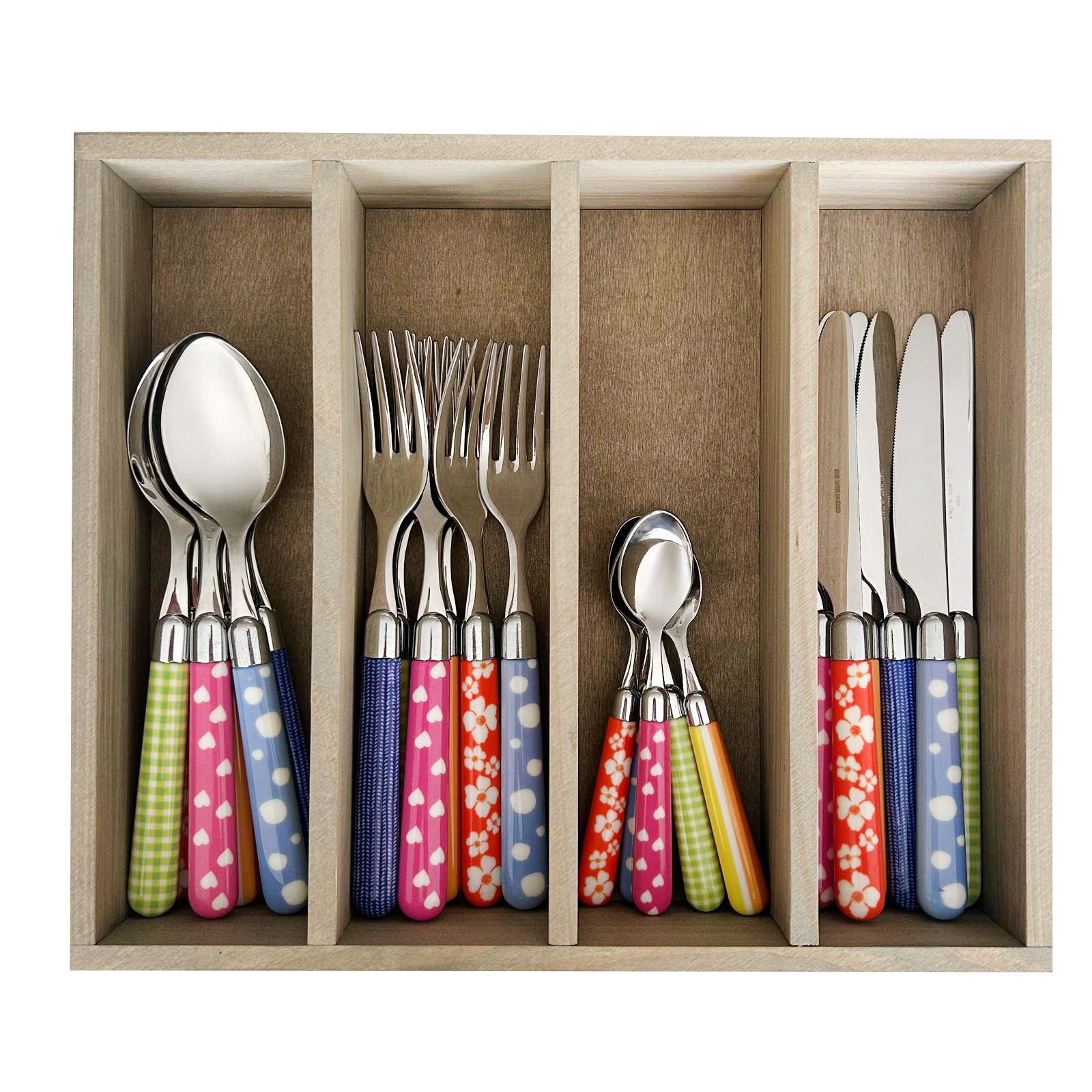 Dieses 24-teilige Besteckset wird in Italien hergestellt. Dieses fröhliche Besteck besteht aus 6 Messer, 6 Gabeln, 6 Esslöffeln und 6 Dessertlöffeln. Die verwendeten Materialien sind von ausgezeichneter Qualität. Die Klinge verbiegt sich nicht, hat eine Stahlstärke von 2,0 mm und besteht aus 18/10 Edelstahl. Der Griff besteht aus festem Kunststoff PBT. Die Farbe nimmt nicht ab, weil sie mit einer speziellen Drucktechnik (Sublimation) aufgetragen wird. Die Klingen sind mit einer feinen Verzahnung ausgestattet, die dafür sorgt, dass sie lange scharf bleiben und gut schneiden. Das Set wird in einer schön gefertigten Besteckbox aus europäischem Nadelholz geliefert. Die robuste Besteckdose ist nicht nur eine schöne Geschenkbox, sondern auch hervorragend zur Aufbewahrung des Bestecks geeignet. Das Besteck ist für die Spülmaschine geeignet.
