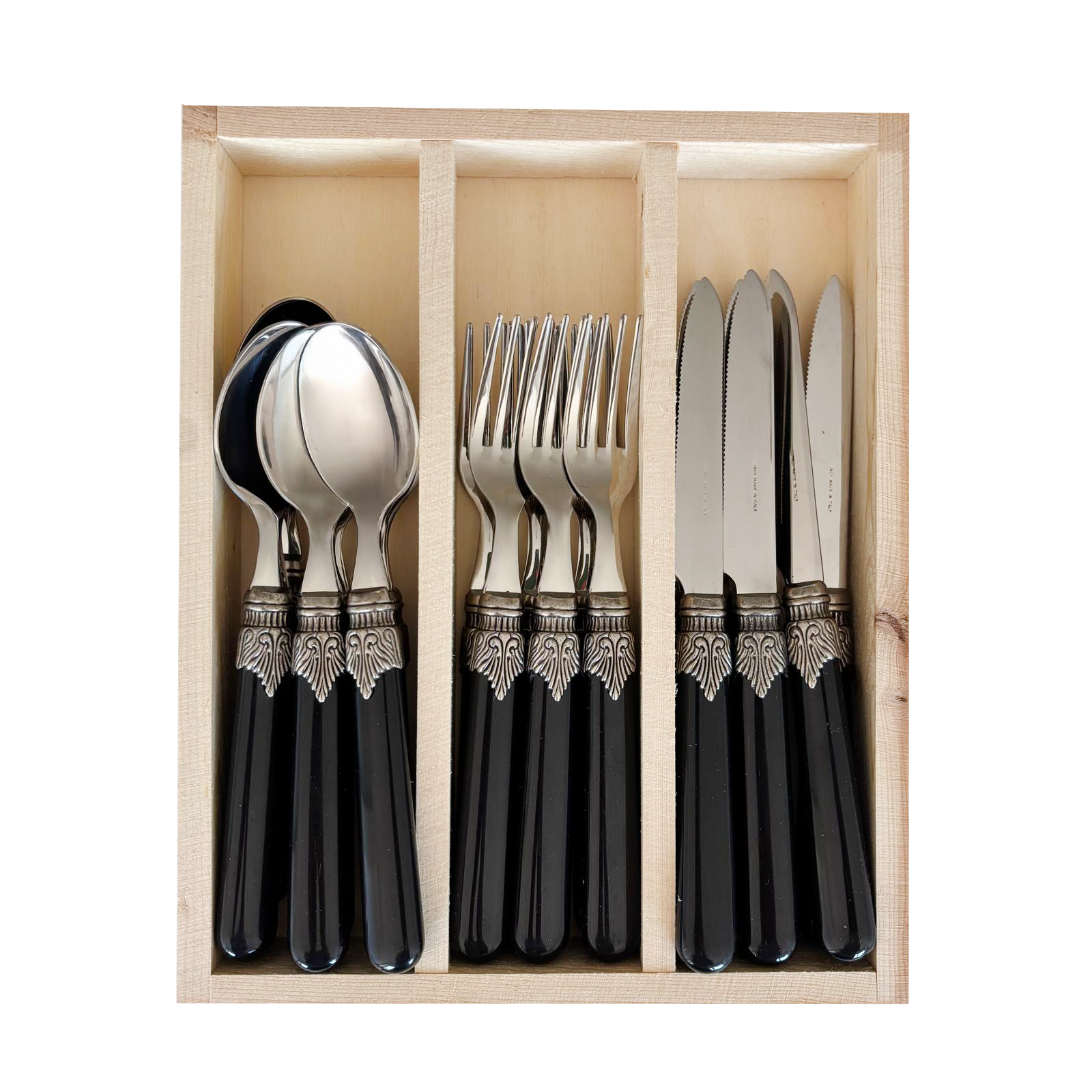 Das 18-teilige Set für 6 Personen besteht aus je 6 Frühstücksmessern, 6 Frühstücksgabeln und 6 Frühstückslöffeln. Jedes Besteckteil verfügt über eine Klinge aus rostfreiem Stahl, einen Kunststoffgriff und ein mittig angebrachtes Aluminiumornament. Die Materialien sind von höchster Qualität. Die Klinge ist 1,5 mm stark, biegefest und aus rostfreiem 18/10-Stahl gefertigt. Der Griff besteht aus Kunststoff. Die Farbe verschleißt nicht, da sie über den gesamten Griff aufgetragen ist (und nicht nur als dünne Schicht auf der Oberfläche).