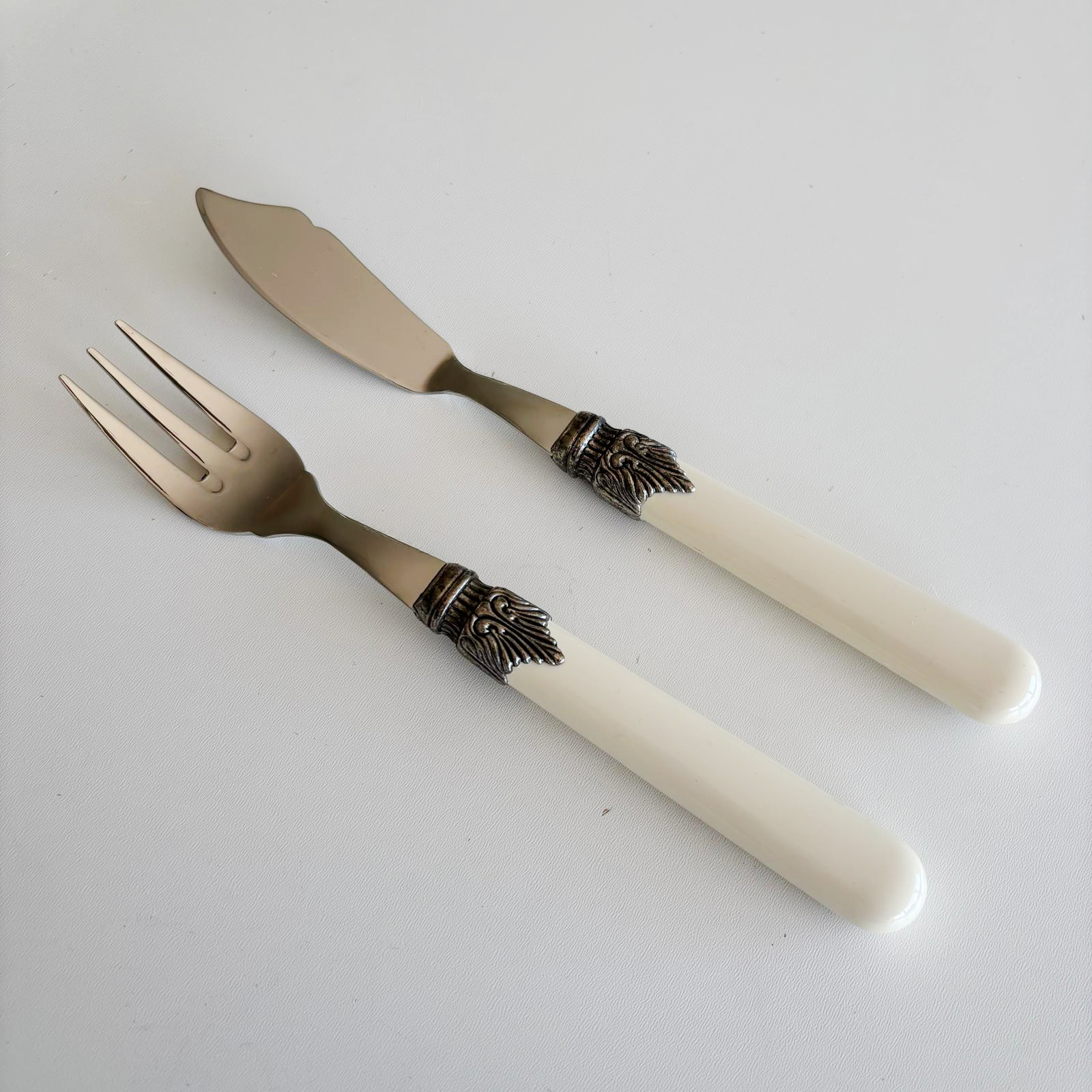 Das 12-teilige Set reicht für 6 Personen und umfasst je sechs Fischmesser und -gabeln. Jedes Stück hat eine Klinge aus rostfreiem Stahl, einen Kunststoffgriff und ein Aluminiumornament in der Mitte. Die Materialien sind von hervorragender Qualität. Die Klinge ist 1,5 mm dick, biegefest und aus rostfreiem 18/10-Stahl gefertigt. Der Griff besteht aus Kunststoff. Die Farbe verschleißt nicht, da sie über den gesamten Griff aufgetragen ist (und nicht als dünne Schicht auf der Oberfläche).