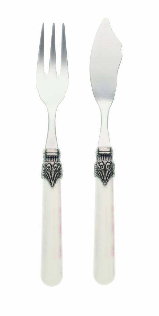 Das 2-teilige Set ist für 1 Person und besteht aus 1 Fischmesser und 1 Fischgabel. Jedes Besteckteil besteht aus einer Edelstahlklinge, einem Kunststoffgriff (PBT) und einem Aluminiumornament in der Mitte. Die Materialien sind von sehr solider Qualität. Die Klinge ist 2,0 mm stark, verbiegt sich nicht und besteht aus 18/10 Edelstahl. Der Griff besteht aus Kunststoff mit leicht verwittertem Effekt. Die Farbe verschleißt nicht, da sie über den gesamten Griff aufgetragen ist (und nicht als dünne Schicht auf der Oberfläche).