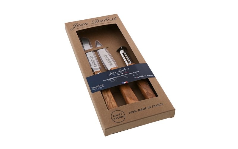 3-teiliges Küchenmesserset: Tomaten-/Baguettemesser, Schälmesser und Sparschäler. Klingen aus hochwertigem französischem Edelstahl, laserbedruckt mit dem Jean-Dubost-Logo. 100 % entworfen und hergestellt in Thiers, Frankreich. Handwäsche empfohlen.