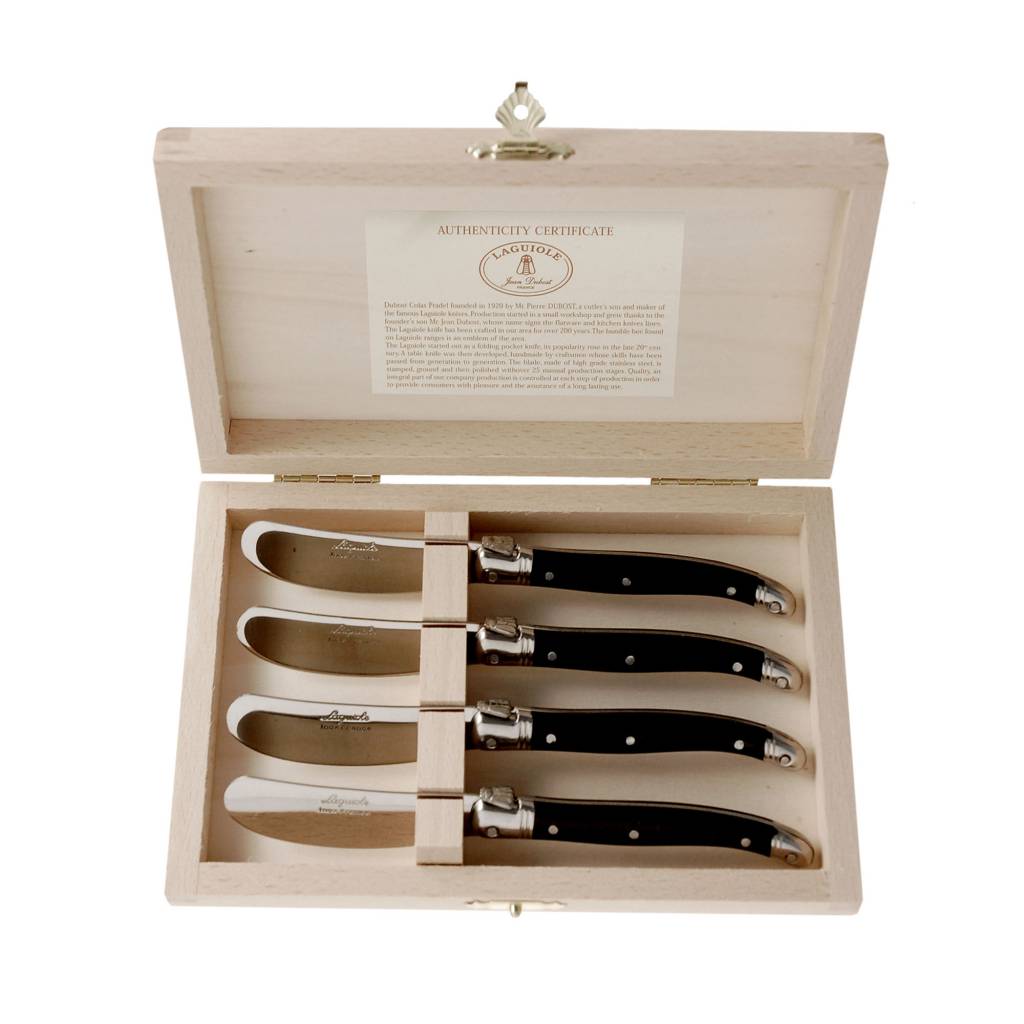 Dieses 4-teilige Buttermesserset Laguiole wird im hundertjährigen französischen Familienunternehmen Jean Dubost hergestellt. Die verwendeten Materialien sind von ausgezeichneter Qualität. Die Klinge ist 1,2 mm dick, verbiegt sich nicht und besteht aus Edelstahl. Der Griff besteht aus Acryl (PMMA), einem starken Kunststoff. Die Farbe nutzt sich nicht ab, da sie auf den gesamten Griff aufgetragen wurde. Die Buttermesser haben eine glatt geschliffene Klinge und schneiden gut. Diese kleinen Streumesser werden nicht nur für Butter verwendet, sondern auch für Tapenaden, Weichkäse, Pasteten usw. Das Set wird vollständig in Frankreich hergestellt und mit einem Laguiole-Echtheitszertifikat versehen. Das Set wird in einer schön verarbeiteten Schachtel aus europäischem Pappelholz geliefert: schön als Geschenk und praktisch zur Aufbewahrung der Buttermesser. Die Klingen sind spülmaschinenfest.