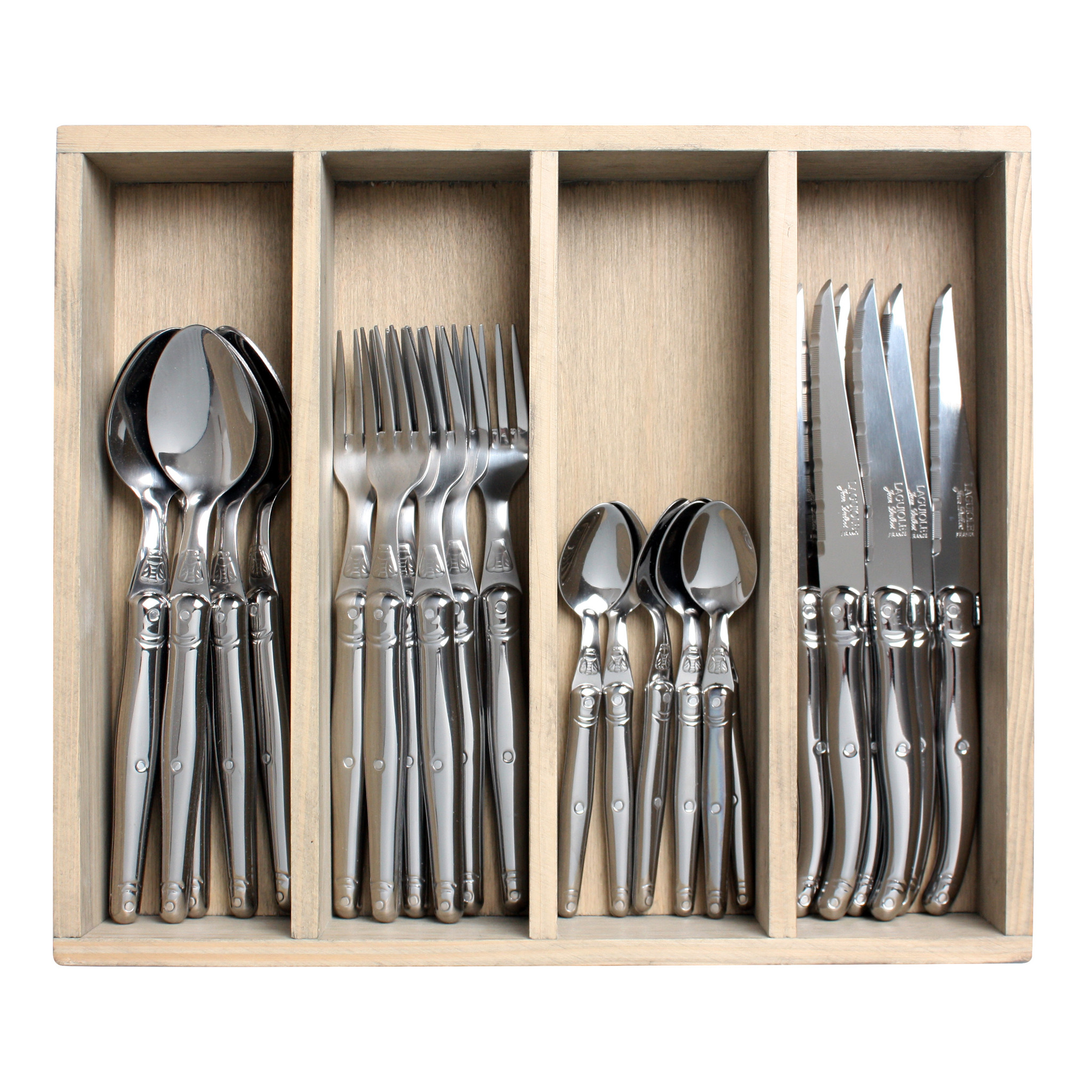 Dieses 24-teilige Laguiole-Besteck aus Edelstahl wird im 100 Jahre alten französischen Familienunternehmen Jean Dubost hergestellt. Dieses zeitlose Besteck hat einen klassischen Look und besteht aus 6 Steakmessern, 6 Tafelgabeln, 6 Esslöffeln und 6 Dessertlöffeln. Das stilvolle und solide Steakmesser liegt sehr gut in der Hand und hat eine Stahlstärke von 1,2 mm. Die anderen Artikel sind ebenfalls robust und haben eine Stahlstärke von 1,5 mm. Der innere Kern des Griffs besteht aus einem starken, haltbaren Kunststoff (PMMA). Der Mantel des Griffs besteht aus Edelstahl. Die Edelstahlklinge des Steakmessers ist gezahnt und eignet sich hervorragend zum Schneiden von Steaks, Lamm, Pizza, Wild und Rouladen. Das Besteckset wird komplett in Frankreich hergestellt und mit einem Echtheitszertifikat versehen. Das Set wird in einer wunderschön verarbeiteten Holzbesteckbox aus europäischem Weichholz geliefert. Die robuste Besteckbox ist nicht nur eine schöne Geschenkbox, sondern auch sehr gut zur Aufbewahrung des Bestecks geeignet.
