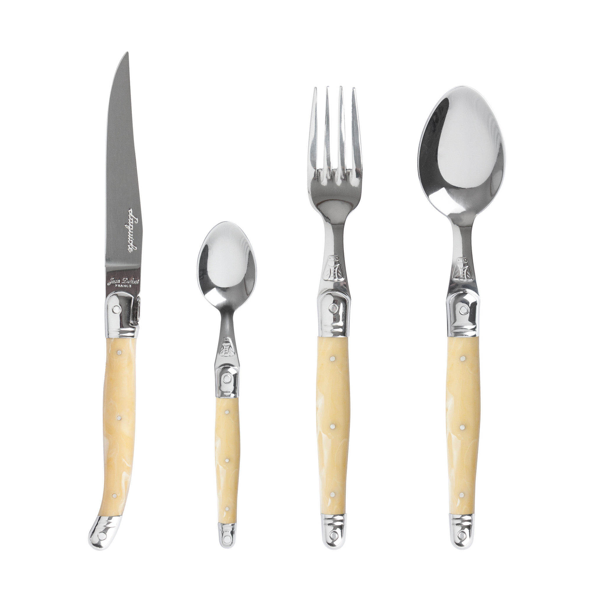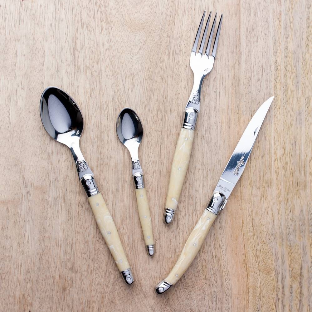 Dieses 24-teilige elfenbeinfarbene Laguiole Besteckset wird im hundertjährigen französischen Familienunternehmen Jean Dubost hergestellt. Dieses zeitlose Besteck im klassischen Look besteht aus 6 Steakmessern, 6 Tafelgabeln, 6 Tafellöffeln und 6 Dessertlöffeln. Das stylische und solide Steakmesser liegt sehr gut in der Hand und hat eine Stahlstärke von 1,5 mm. Auch die anderen Artikel sind gut verarbeitet und haben ebenfalls eine Stahlstärke von 1,5 mm. Der Griff besteht aus einem starken, langlebigen Kunststoff (PMMA). Die Edelstahlklinge des Steakmessers ist glatt geschliffen und eignet sich hervorragend zum Schneiden von Steaks, Lamm, Pizza, Wild und Rouladen. Das Besteckset wird komplett in Frankreich produziert und wird mit Echtheitszertifikat geliefert. Geliefert wird das Set in einer schön verarbeiteten abschließbaren Holzbesteckbox aus europäischem Pappelholz. Die formschöne Besteckbox ist nicht nur eine luxuriöse Geschenkbox, sondern auch sehr gut geeignet, um das Besteck aufzubewahren.