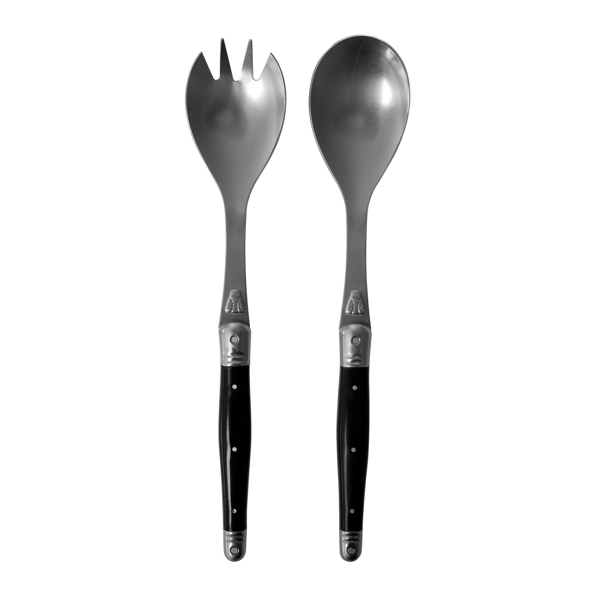 Die Marke Laguiole ist traditionell für ihre Steakmesser bekannt. Heute gibt es zahlreiche weitere Artikel, wie dieses Salatbesteck. Natürlich trägt auch dieses Salatbesteck das Honigbienen-Logo.