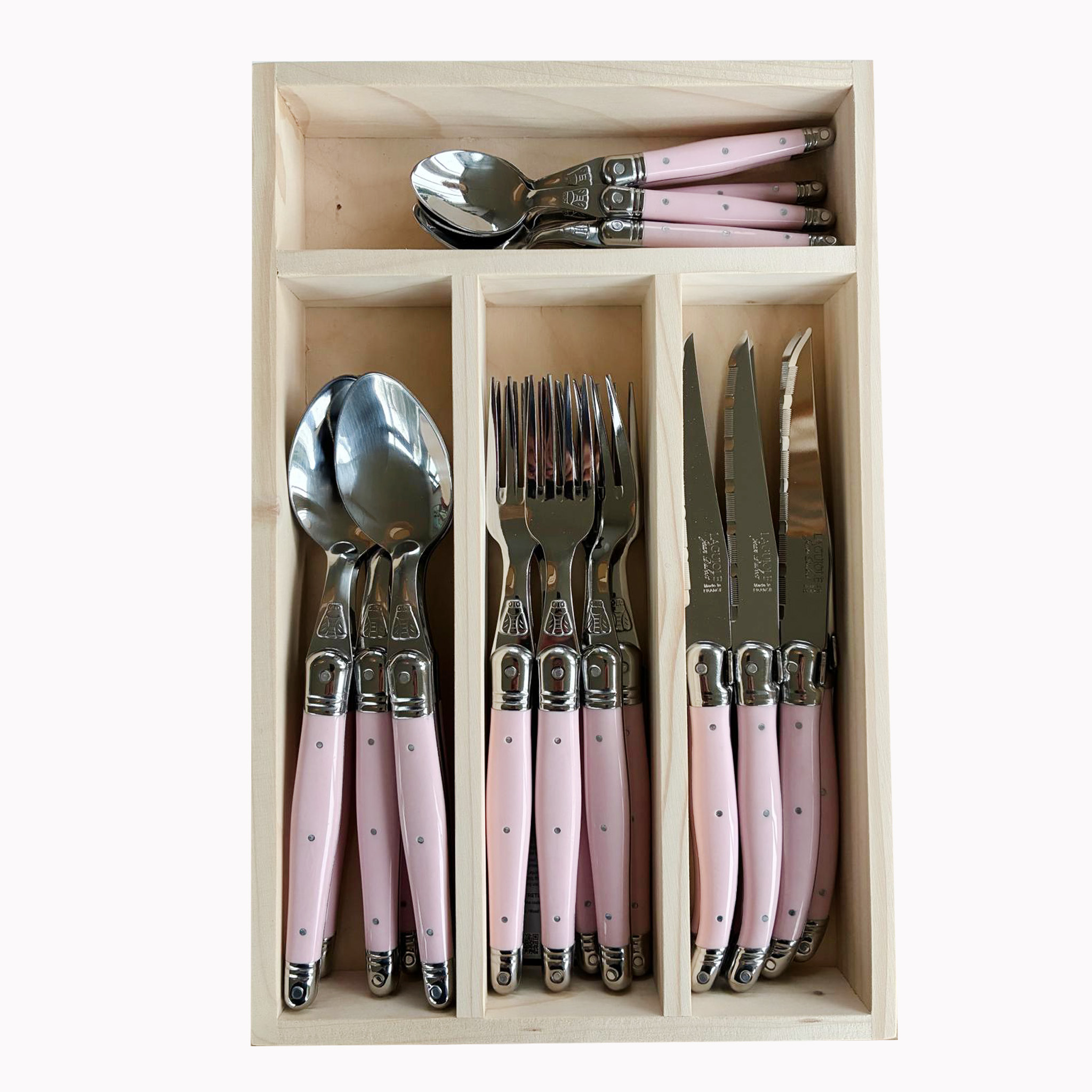 Laguiole Classic Steak Besteck (24-teilig) – Für 6 Personen – 'Pastell Rosa' in Holzbox | Französisches Design