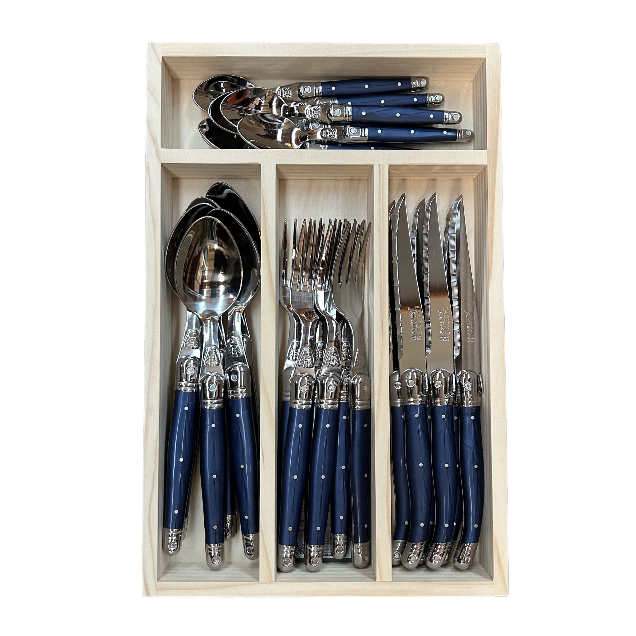 Dieses 24-teilige Laguiole-Besteck wird im 100 Jahre alten französischen Familienunternehmen Jean Dubost hergestellt. Dieses zeitlose Besteck hat einen klassischen Look und besteht aus 6 Steakmessern, 6 Tafelgabeln, 6 Esslöffeln und 6 Dessertlöffeln. Das stilvolle und solide Steakmesser liegt sehr gut in der Hand und hat eine Stahlstärke von 1,2 mm. Die anderen Artikel sind ebenfalls robust und haben eine Stahlstärke von 1,5 mm. Der Griff besteht aus einem starken, haltbaren Kunststoff (PMMA). Die Edelstahlklinge des Steakmessers ist gezahnt und eignet sich hervorragend zum Schneiden von Steaks, Lamm, Pizza, Wild und Rouladen. Das Besteckset wird komplett in Frankreich hergestellt und mit einem Echtheitszertifikat versehen. Das Set wird in einer wunderschön verarbeiteten Holzbesteckbox aus europäischem Weichholz geliefert. Die robuste Besteckbox ist nicht nur eine schöne Geschenkbox, sondern auch sehr gut zur Aufbewahrung des Bestecks geeignet.