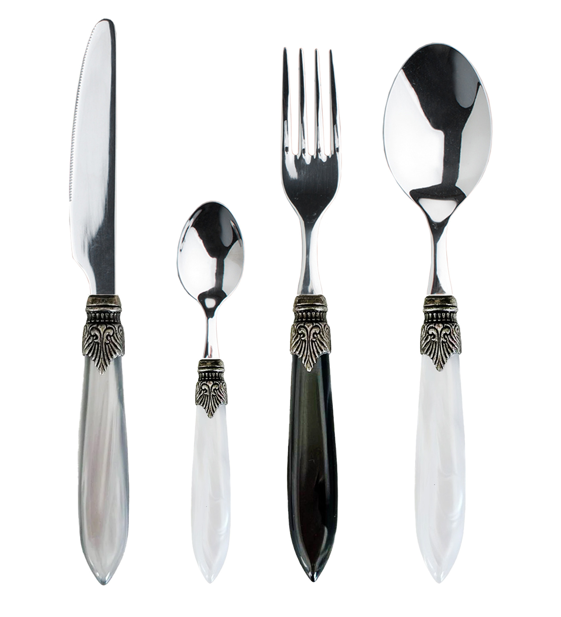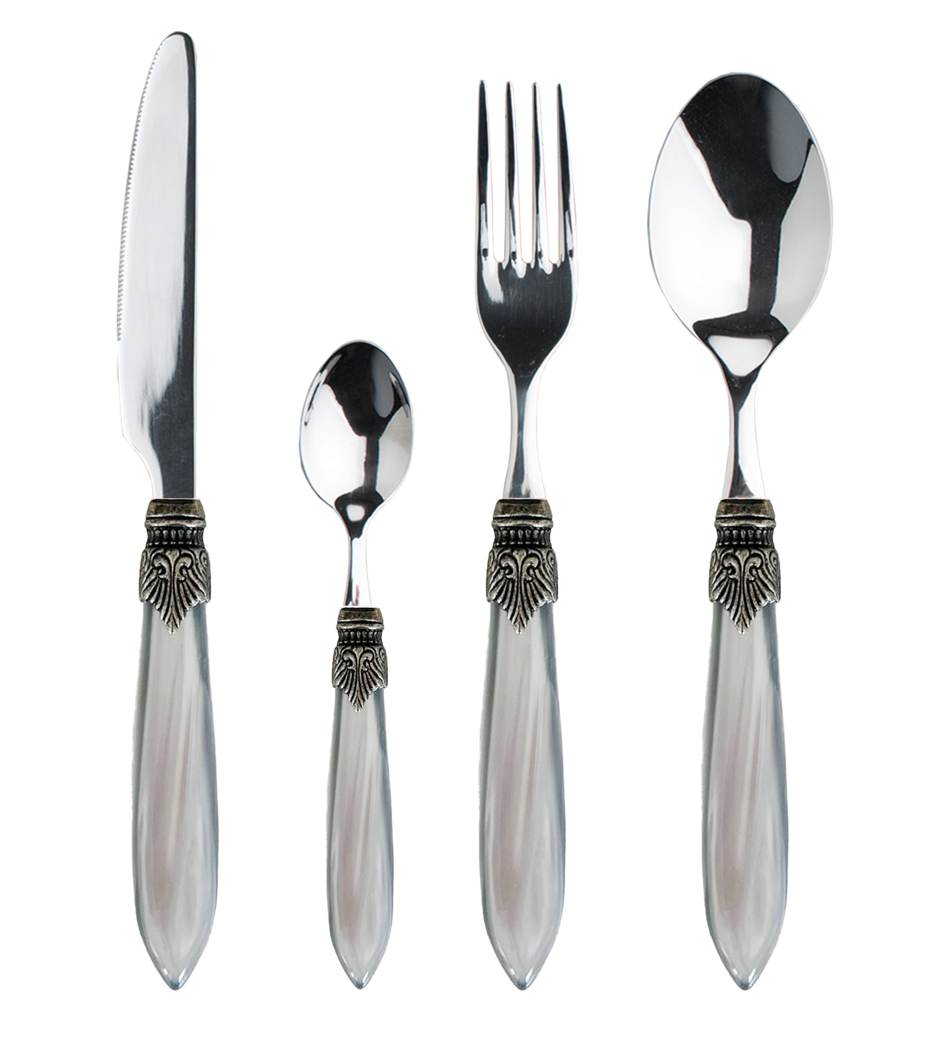 PMMA (Polymethylmethacrylat) ist ein transparenter thermoplastischer Kunststoff, der besser unter dem Namen Acrylat bekannt ist. Dieser starke Kunststoff kann beim Erhitzen leicht in alle möglichen Formen gebracht werden. Das Material ist transparent und daher sehr gut geeignet, um den für dieses Besteck charakteristischen Perlmutt-Effekt nachzuahmen.