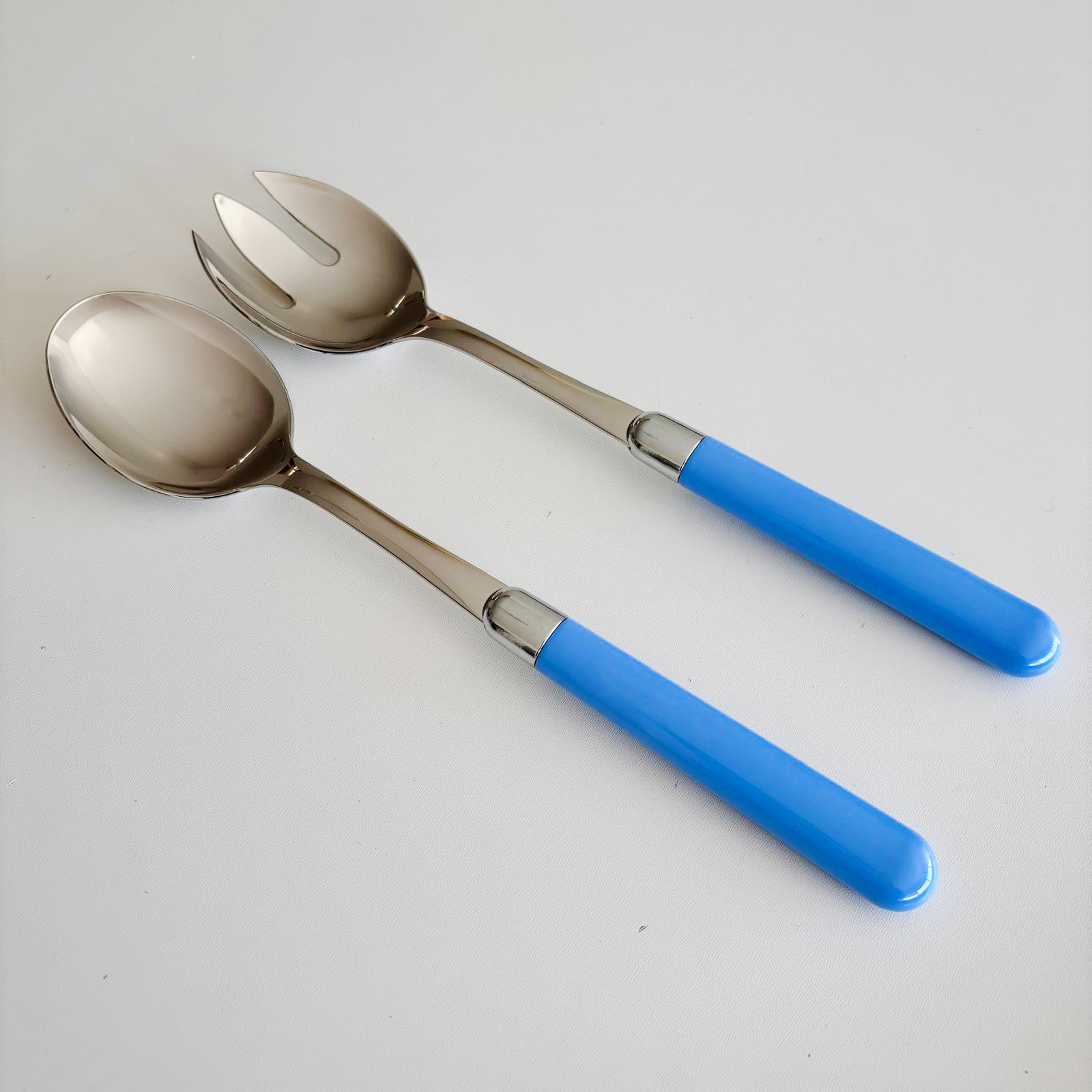 The salad cutlery has a stainless steel blade, a plastic handle and an aluminium ornament in the middle. The materials are of very solid quality. The blade is 1.8 mm thick, does not bend and is made of 18/10 stainless steel. The handle is made of a strong plastic with a smooth glossy effect. The colour will not wear off because it is applied throughout the handle (and not as a thin coating on the surface).