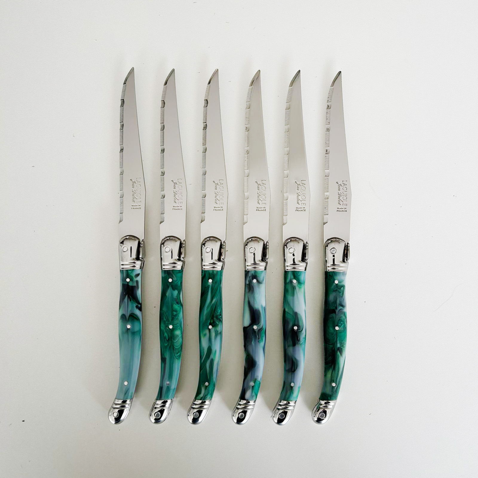 This 6-piece Laguiole steak knife set is made in the 100-year-old French family company Jean Dubost. The materials used are of excellent quality. The blade is 1.2 mm thick, does not bend and is made of stainless steel. The handle is made of acrylic (PMMA), a strong plastic. The color will not wear off because it is applied throughout the handle. The steak knives are provided with a fine knurling. They therefore stay sharp and cut well. In addition to steaks and other meat dishes, these knives are also excellent for slicing pizzas, oven dishes and savory pies. The steak knife set is entirely produced in France and provided with a certificate of authenticity. The set is delivered in a beautifully finished box of European softwood: nice to give as a gift and handy to store the steak knives. The cutlery is suitable for the dishwasher