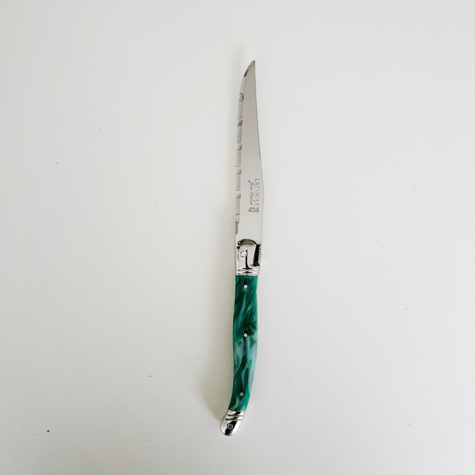 The Laguiole Jean Dubost range is made entirely in France. Apart from a few tropical woods, all parts, such as the steel and the handles, also come from France. In the factory, raw steel (AISI 420 standard with hardness HRC 52/56) is transformed into a razor-sharp, shiny polished blade in a process of 9 production phases. 1.5 million Laguiole steak knives are made every year, almost half of which are destined for export.