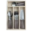 This 24-piece Provence cutlery set is made in Italy. This stylish cutlery consists of 6 dinner knives, 6 dinner forks, 6 dinner spoons and 6 dessert spoons. The materials are of excellent quality. The blade consists of one piece over the entire length and does not bend. It also has a thickness of 1.8 mm and is made of stainless steel. The knives have a fine serration which makes them cut well and stay sharp for a long time. The cutlery is suitable for use in the dishwasher. The set is supplied in a beautifully finished wooden cutlery box made of European softwood. The sturdy cutlery box is not only a nice gift box but also very suitable for storing the cutlery.
