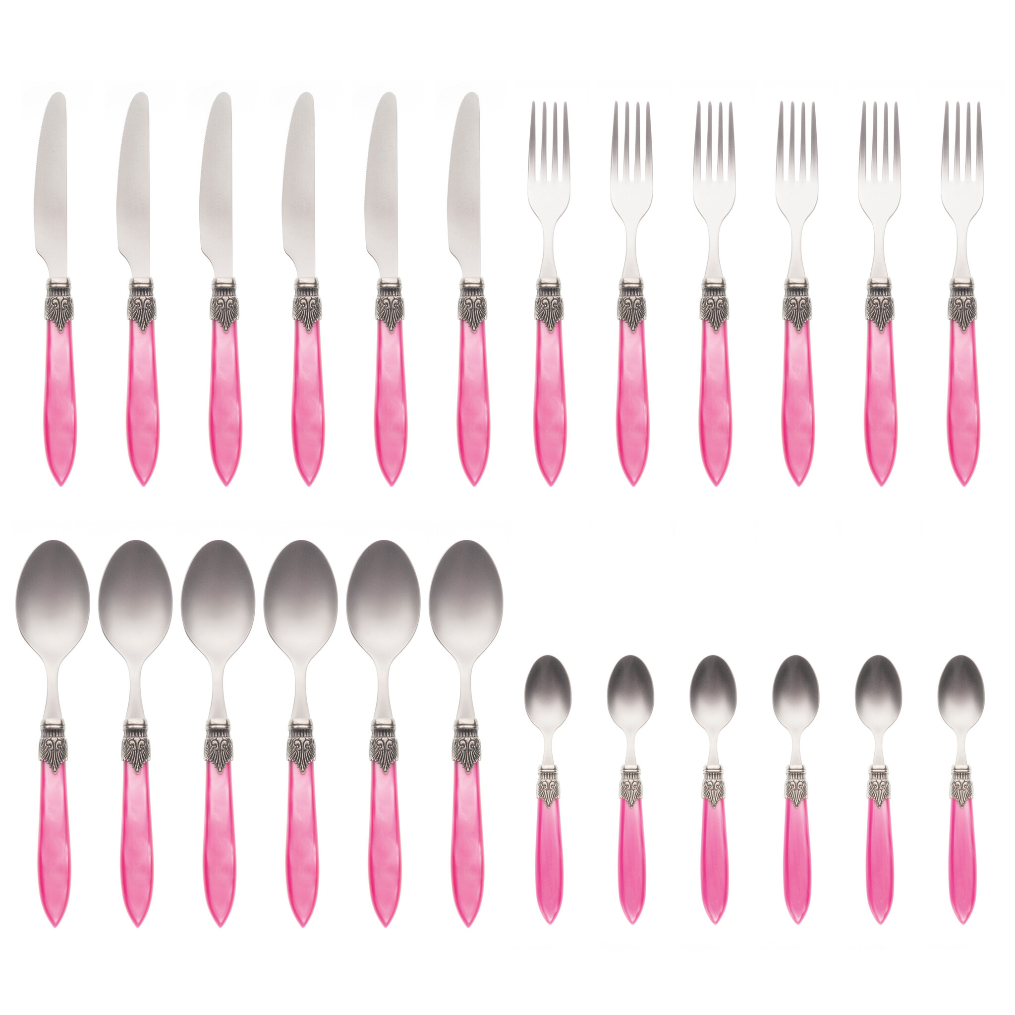 The 24-piece set is for 6 people and consists of 6 dinner knives, 6 dinner forks, 6 dinner spoons and 6 dessert spoons. Each cutlery part is composed of a stainless steel blade, a plastic handle and an aluminum ornament in the center. The materials are of very good quality. The blade is 2.0 mm thick, does not bend and is made of 18/10 stainless steel. The handle is made of acrylic, a strong plastic with a slightly shiny mother-of-pearl effect. The color will not wear off because it is applied throughout the handle (and not as a thin coating on the surface).