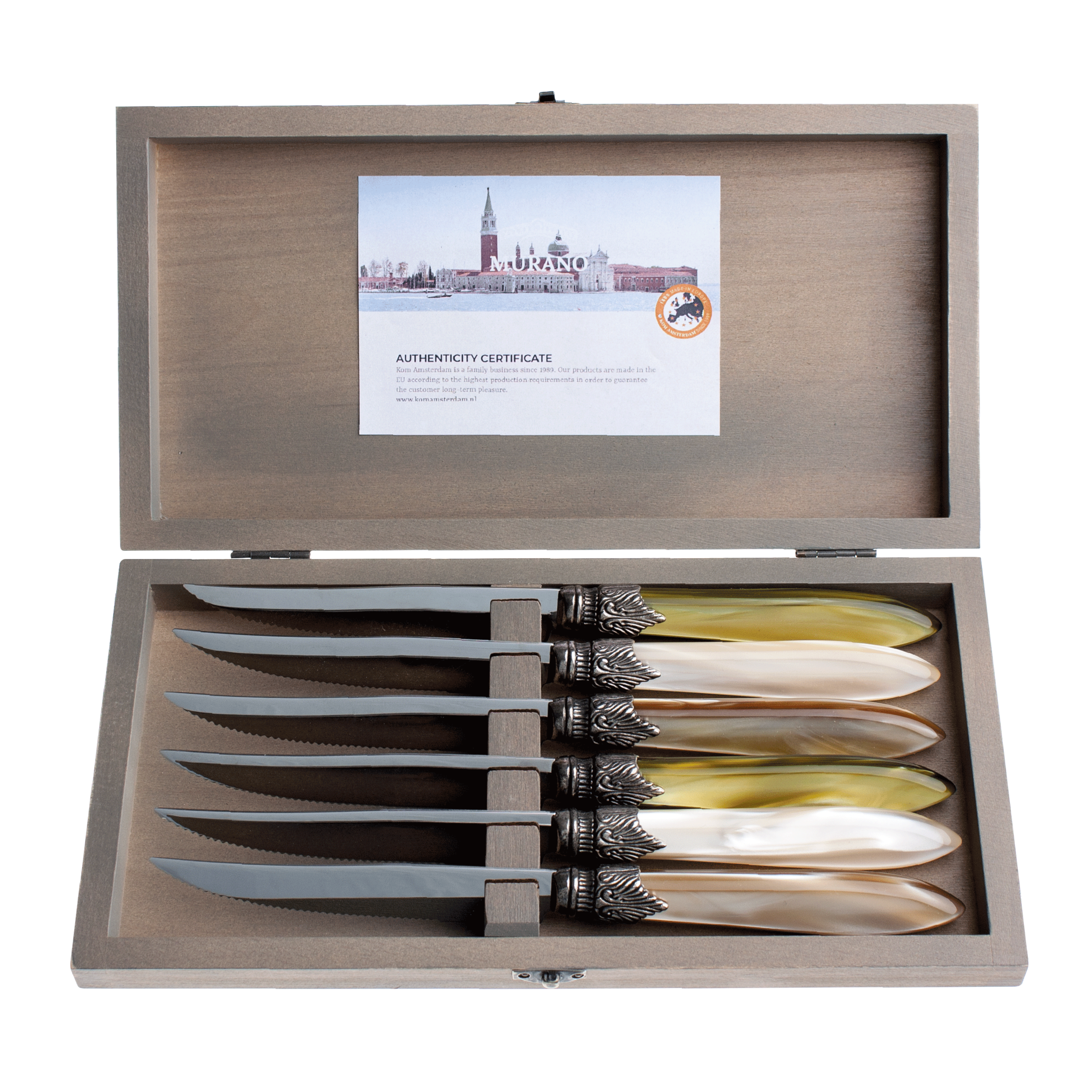 This 6-piece Murano steak knife set is made in Italy. The materials used are of excellent quality. The blade is 1.5 mm thick, does not bend and is made of stainless steel. The handle is made of acrylic, a strong plastic with a slightly shiny mother-of-pearl effect. The color will not wear off because it is applied throughout the handle. The steak knives are provided with a fine knurling. They therefore stay sharp and cut well. In addition to steaks and other meat dishes, these knives are also ideal for slicing pizzas, oven dishes and savory pies. The set is delivered in a beautifully finished box made of European softwood: nice to give as a gift and handy to store the steak knives. The cutlery is suitable for the dishwasher.