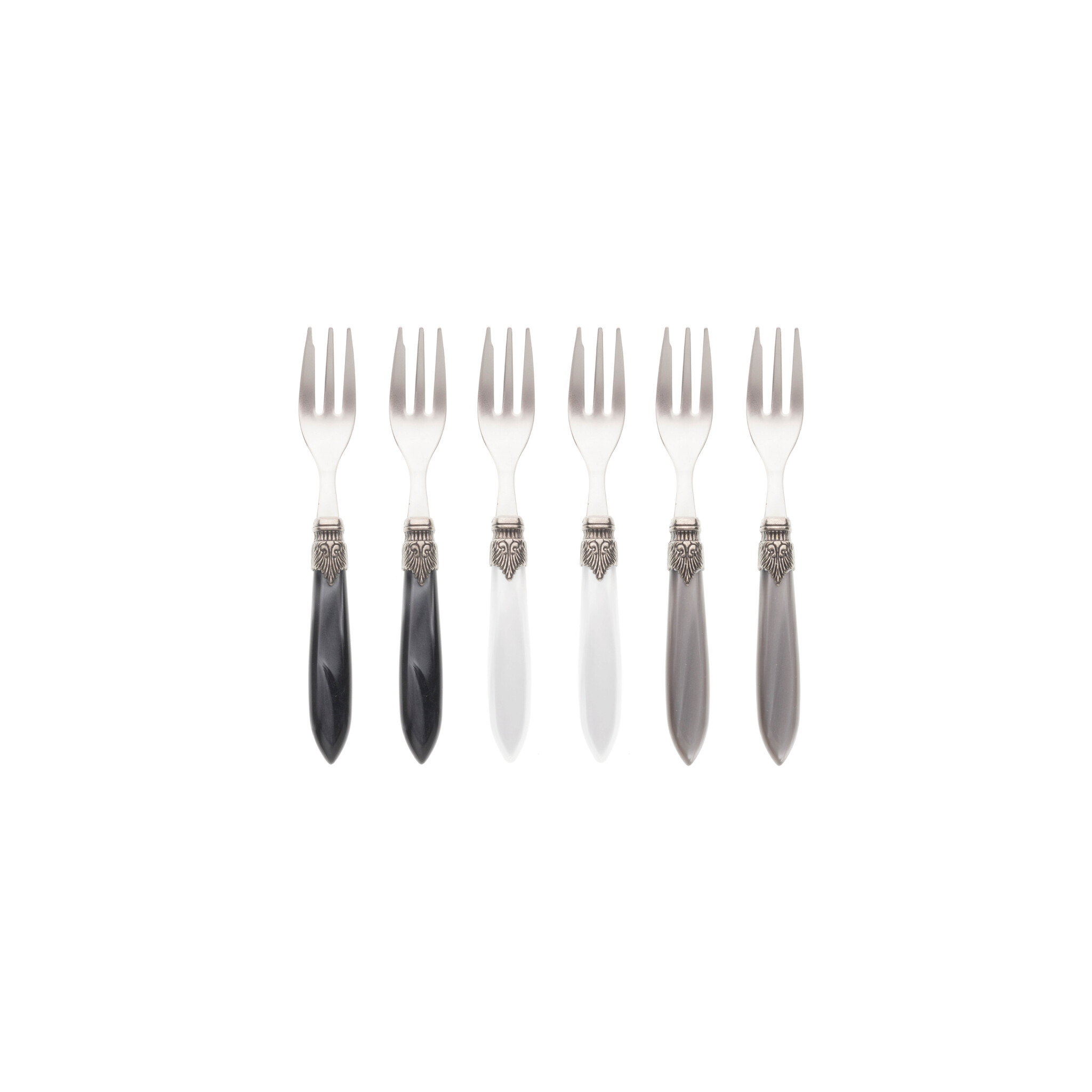 The cake fork has a stainless steel blade, a plastic handle and an aluminum ornament in the middle. The materials are of very good quality. The blade is 1.5 mm thick, does not bend and is made of 18/10 stainless steel. The handle is made of acrylic, a strong plastic with a slightly shiny mother-of-pearl effect. The color will not wear off as it is applied throughout the handle (and not as a thin coating on the surface).