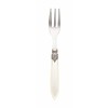 The cake fork has a stainless steel blade, a plastic handle and an aluminum ornament in the middle. The materials are of very good quality. The blade is 1.5 mm thick, does not bend and is made of 18/10 stainless steel. The handle is made of acrylic, a strong plastic with a slightly shiny mother-of-pearl effect. The color will not wear off as it is applied throughout the handle (and not as a thin coating on the surface).