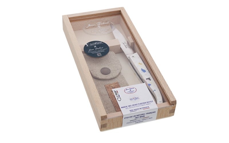 9.5 cm long stainless steel blade, 2.5 mm thick, with a satin finish. The handle is made of recycled plastic. Total knife length: 21.0 cm. Wooden display case with a transparent lid and includes a recycled French linen case. Hand wash only.