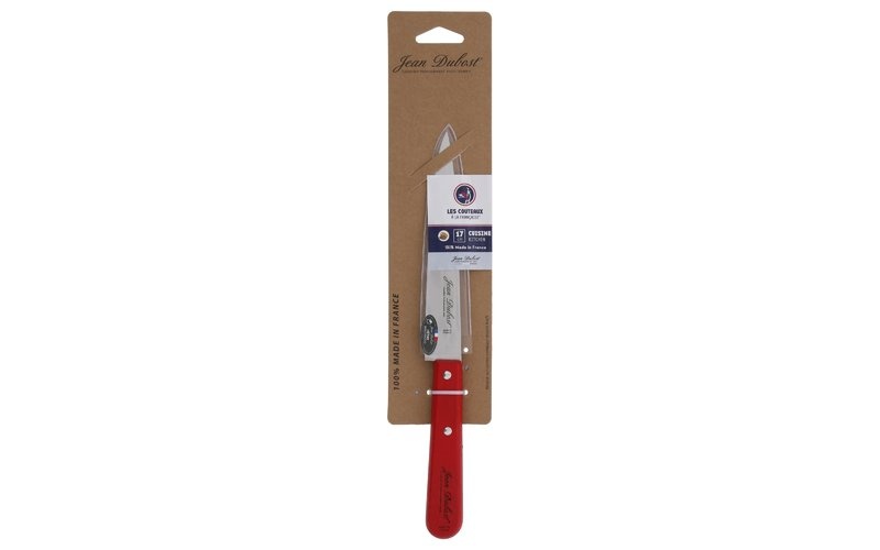 17cm blade in high quality French stainless steel (X47CR13, HRC 52-55) Traditional handle with 2 rivets in beech wood from French forests, stained red 100% designed and produced in Thiers, France Hand washing recommended