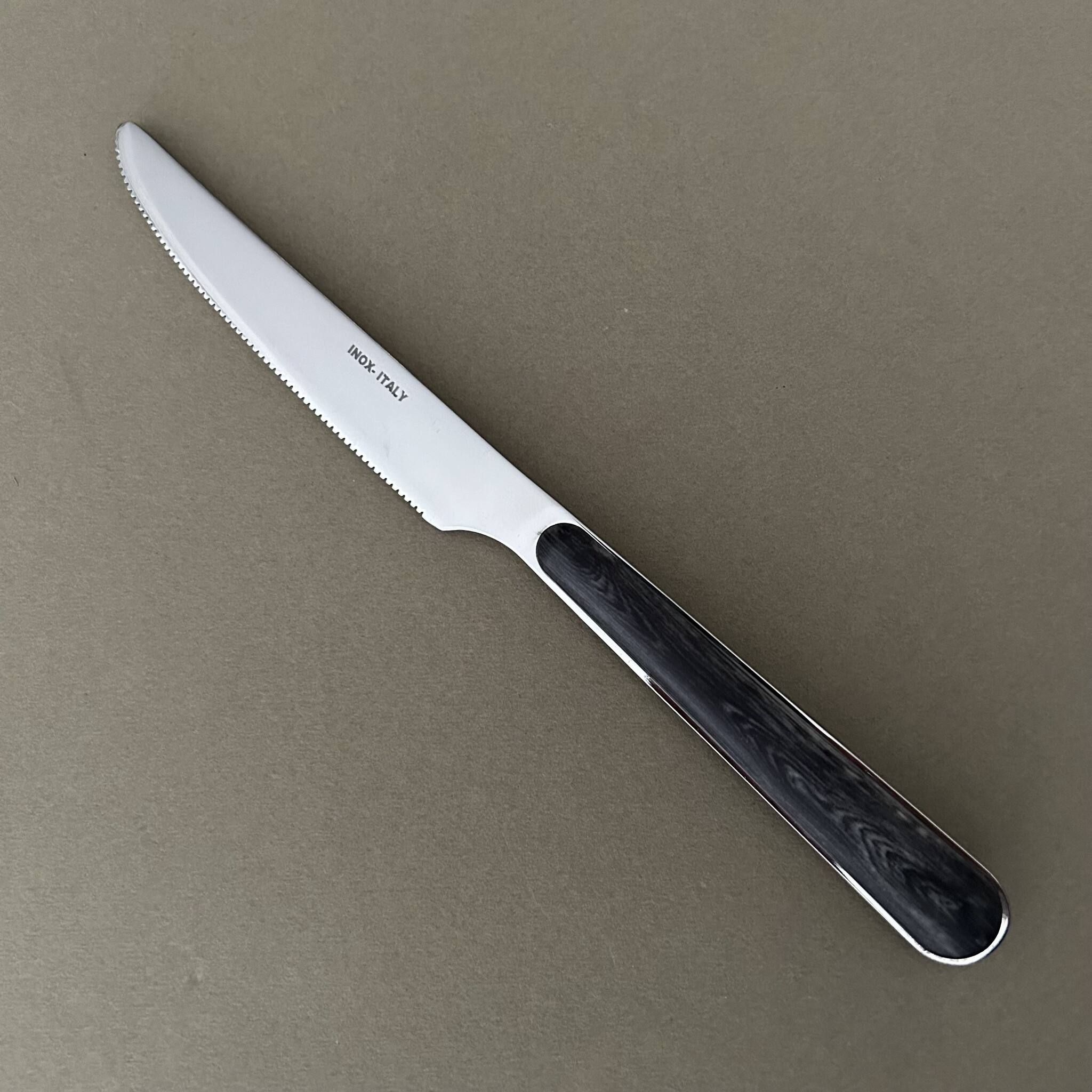 This Wood Style dessert knife is made in Italy. The materials are of excellent quality. The blade consists of one piece over its entire length and does not bend. Furthermore, it has a thickness of 1.8 mm and is made of stainless steel. The handle is not made of wood, but of a strong plastic that is virtually indistinguishable from real wood. In addition, the handle has been treated in such a way that it feels like real wood and not like a smooth plastic. The wood pattern is applied with a special technique and will not fade. The big advantage of this cutlery is that, unlike real wood, it can be put in the dishwasher without any problems. The dessert knife is provided with a fine serration so that it cuts well and remains sharp for a long time.