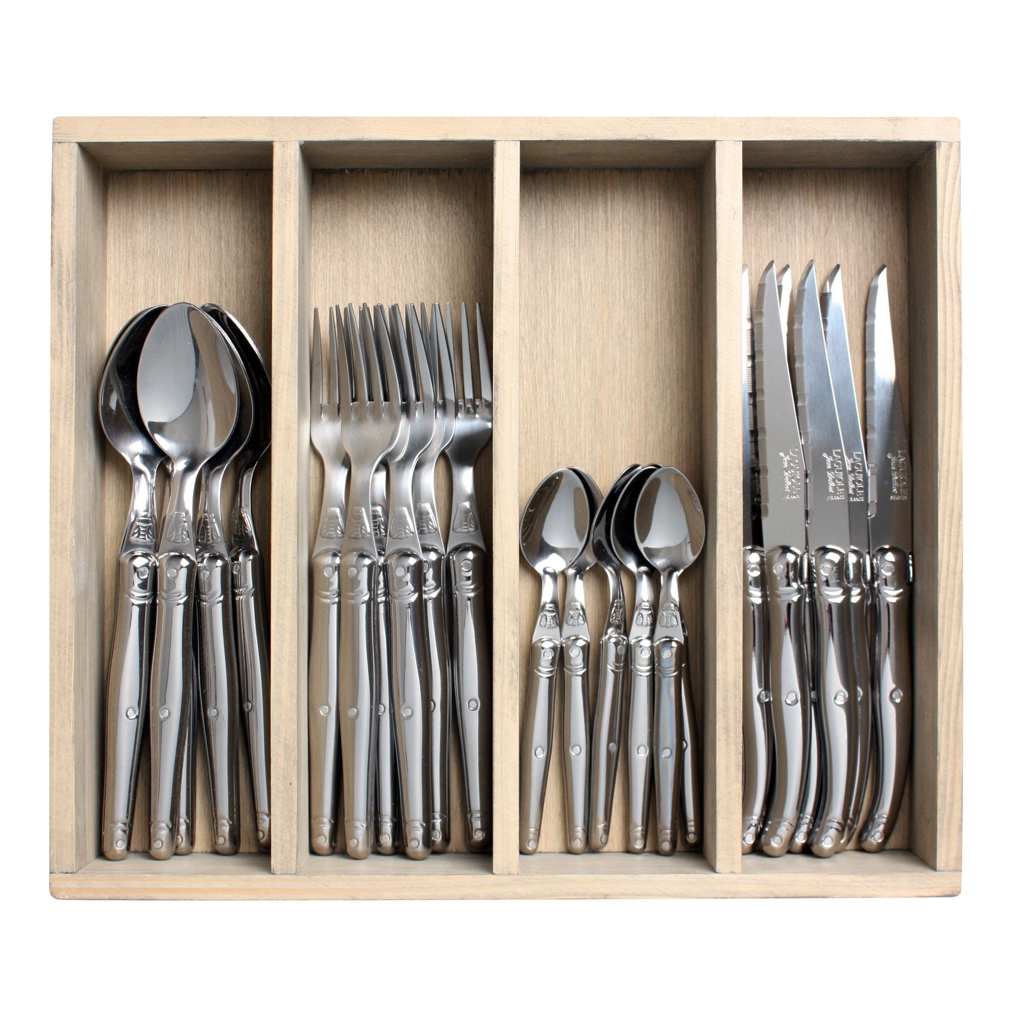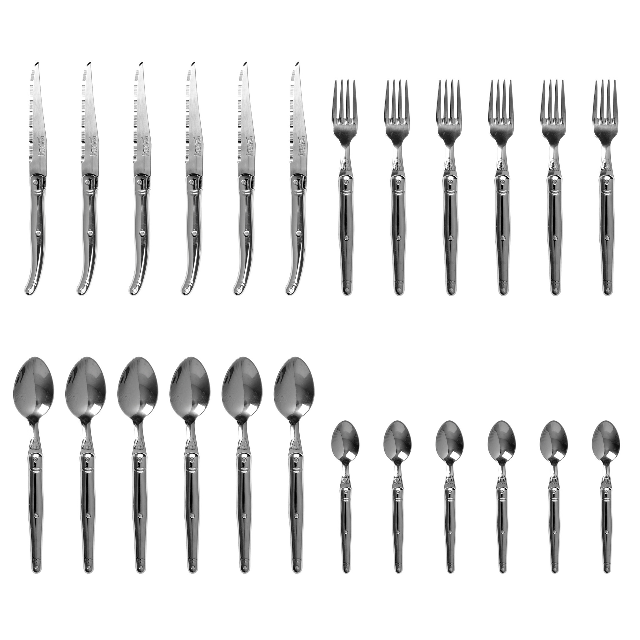 Ce service de couverts Laguiole 24 pièces en acier inoxydable est fabriqué dans l'entreprise familiale française centenaire Jean Dubost. Cette coutellerie intemporelle a un look classique et se compose de 6 couteaux à steak, 6 fourchettes à dîner, 6 cuillères à soupe et 6 cuillères à dessert. Le couteau à steak élégant et solide tient très bien dans la main et a une épaisseur d'acier de 1,2 mm. Les autres articles sont également de conception solide et ont une épaisseur d'acier de 1,5 mm. Le noyau interne de la poignée est en plastique solide et durable (PMMA). Le boîtier de la poignée est en acier inoxydable. La lame en acier inoxydable du couteau à steak est dentelée et excellente pour couper les steaks, l'agneau, les pizzas, le gibier et les roulades. Le service de couverts est entièrement produit en France et est livré avec un certificat d'authenticité. L'ensemble est livré dans une boîte à couverts en bois magnifiquement finie en bois résineux européen. La boîte à couverts robuste n'est pas seulement une belle boîte cadeau, mais également très appropriée pour ranger les couverts.