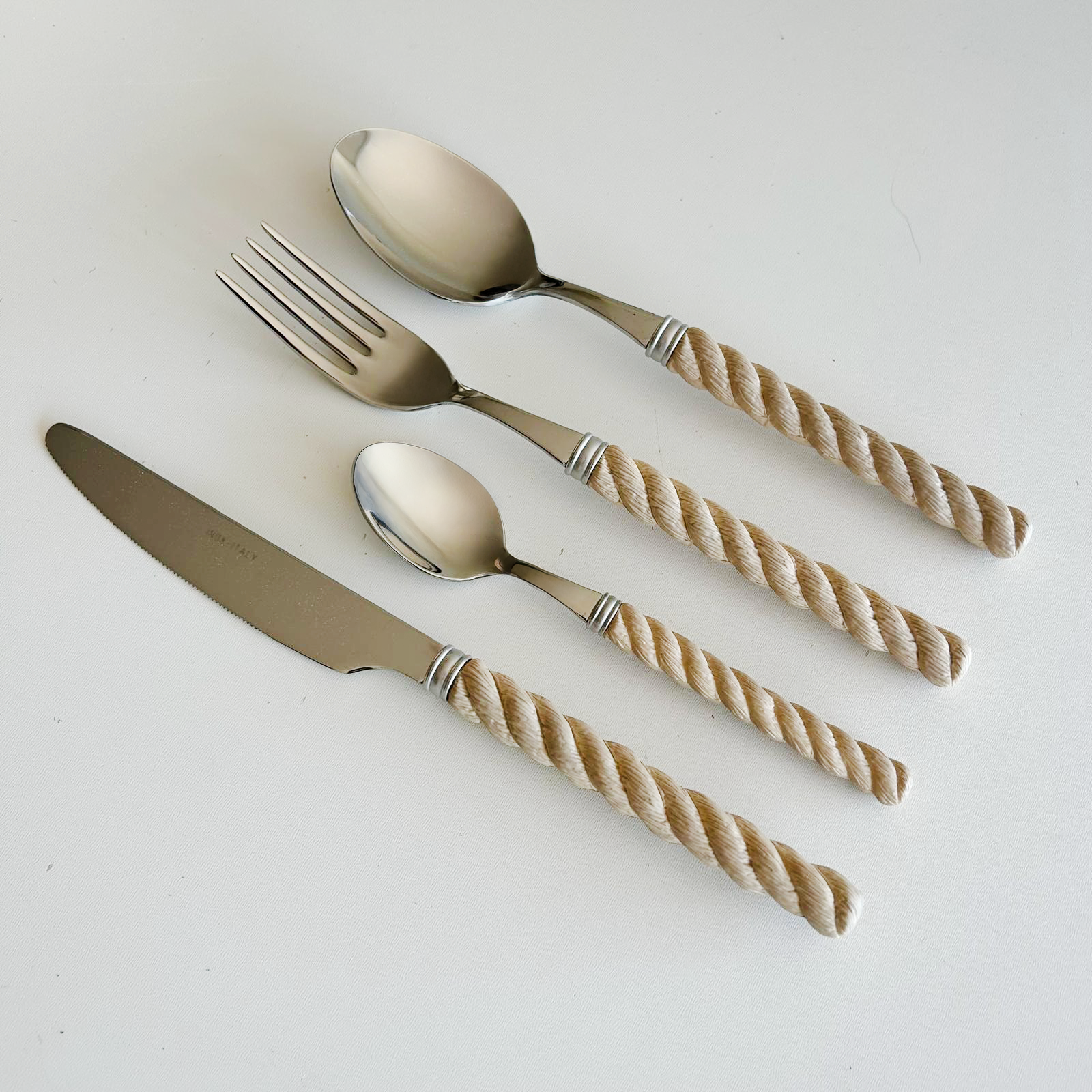 Cet ensemble de couverts Maritime de 24 pièces est fabriqué en Italie. Ces couverts élégants se composent de 6 couteaux de table, 6 fourchettes de table, 6 cuillères de table et 6 cuillères à dessert. Les matériaux sont d'excellente qualité. La lame ne se plie pas, est en acier inoxydable et a une épaisseur de 1,8 mm. Les couteaux ont une fine denture pour qu'ils coupent bien et restent tranchants longtemps. La poignée est en plastique et ressemble à une corde de bateau réaliste. Les couverts peuvent être utilisés au lave-vaisselle. L'ensemble est livré dans une boîte à couverts en bois de résineux européen aux finitions soignées. La boîte à couverts robuste n'est pas seulement une jolie boîte cadeau, mais elle est également très adaptée pour ranger les couverts.
