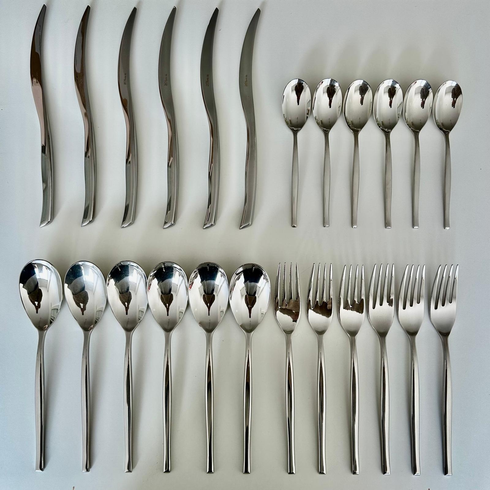 Cet ensemble de couverts de 24 pièces de Bugatti contient 6 couteaux, 6 cuillères, 6 fourchettes et 6 cuillères à dessert en acier inoxydable. Les couverts sont de haute qualité (acier inoxydable 18/10) et passent au lave-vaisselle.