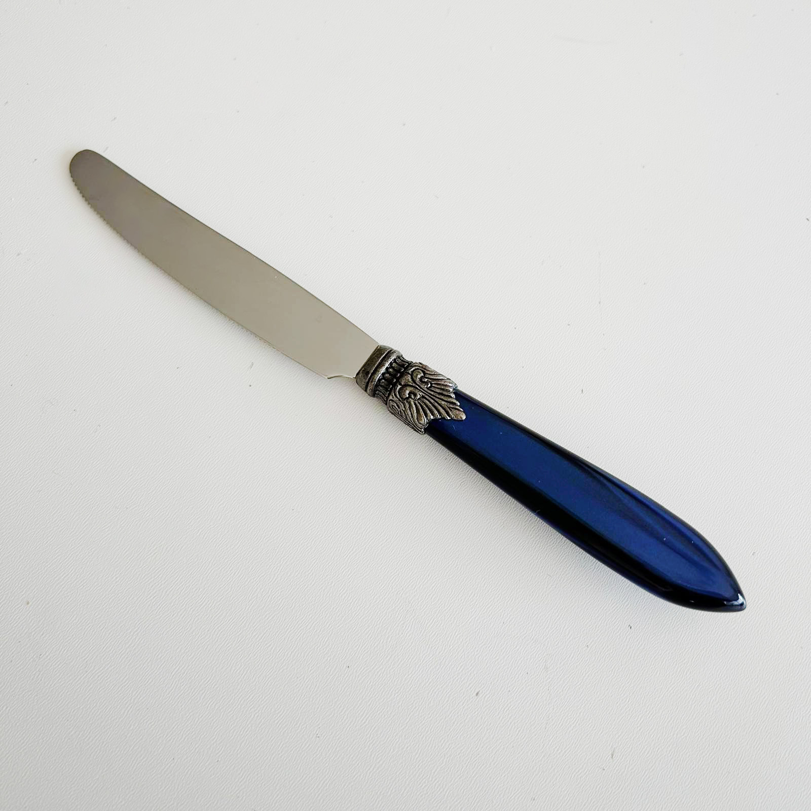 Le couteau à fruits a une lame en acier inoxydable, un manche en plastique et un ornement en aluminium au milieu. Les matériaux sont de très bonne qualité. La lame a une épaisseur de 1,2 mm, ne se plie pas et est en acier inoxydable 18/10. Il coupe bien et reste tranchant car il a une légère dentelure. Le manche est en acrylique, un plastique solide avec un effet nacré légèrement brillant. La couleur ne s'effacera pas car elle est appliquée sur toute la poignée (et non comme une fine couche sur la surface).
