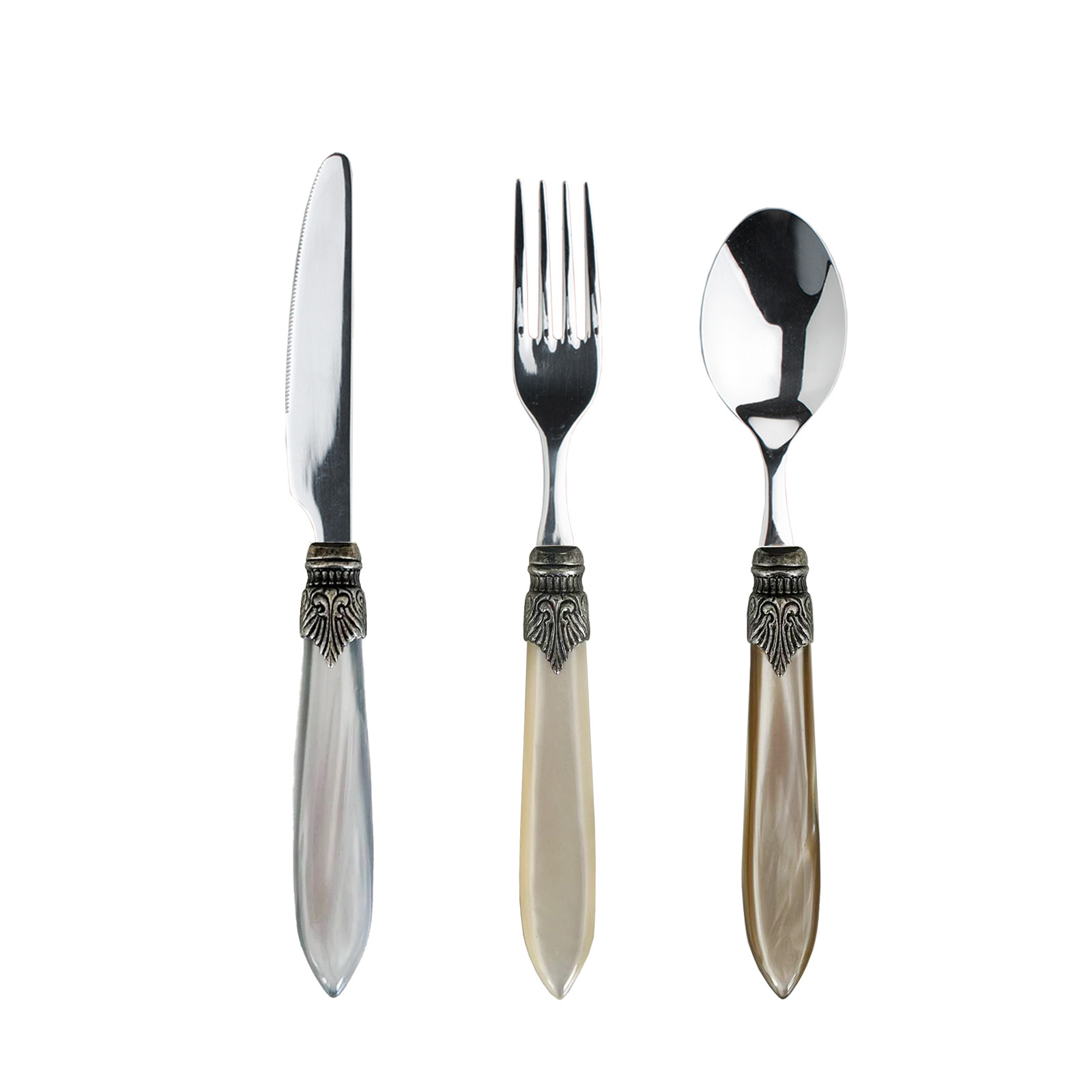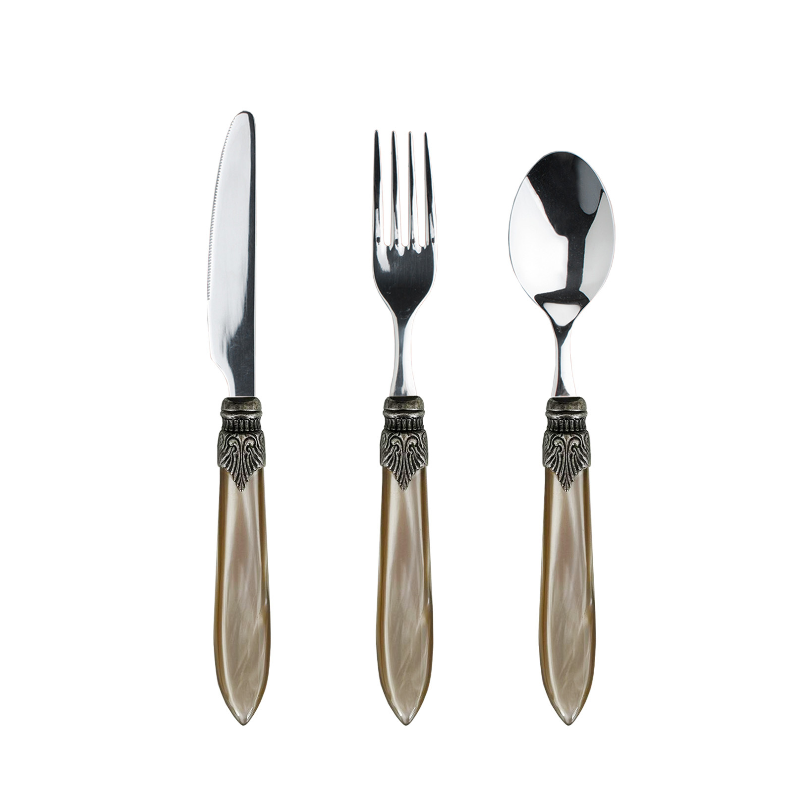 Le service de 18 pièces est pour 6 personnes et se compose de 6 couteaux, 6 fourchettes et 6 cuillères. Chaque couvert est doté d'une lame en acier inoxydable, d'un manche en plastique et d'un ornement central en aluminium. Les matériaux sont d'excellente qualité. La lame, épaisse de 2,0 mm et résistante à la flexion, est en acier inoxydable 18/10. Le manche est en acrylique, un plastique résistant au fini légèrement brillant et nacré. La couleur ne s'estompe pas, car elle est appliquée sur toute la surface du manche (et non en fine couche).