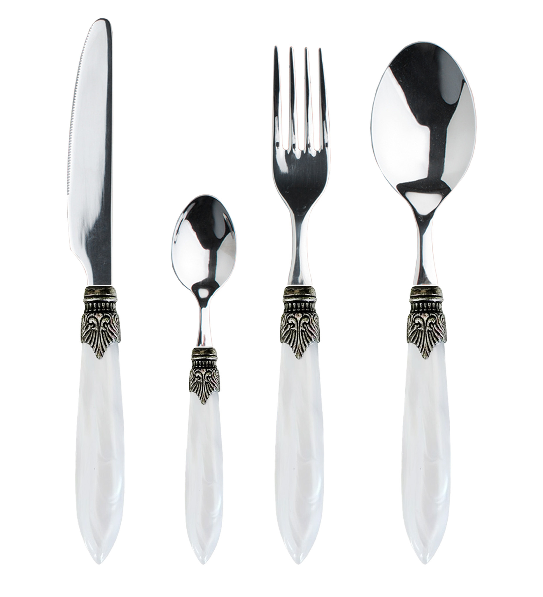 Le service de 24 pièces est pour 6 personnes et se compose de 6 couteaux à dîner, 6 fourchettes à dîner, 6 cuillères à soupe et 6 cuillères à dessert. Chaque pièce est composée d'une lame en acier inoxydable, d'un manche en plastique et d'un ornement en aluminium. Les matériaux sont de très bonne qualité. La lame a une épaisseur de 2,0 mm, ne se plie pas et est en acier inoxydable 18/10. Le manche est en acrylique, un plastique solide avec un effet nacré légèrement brillant. La couleur ne s'efface pas car elle est appliquée dans la masse (au lieu d'une fine couche sur la surface).
