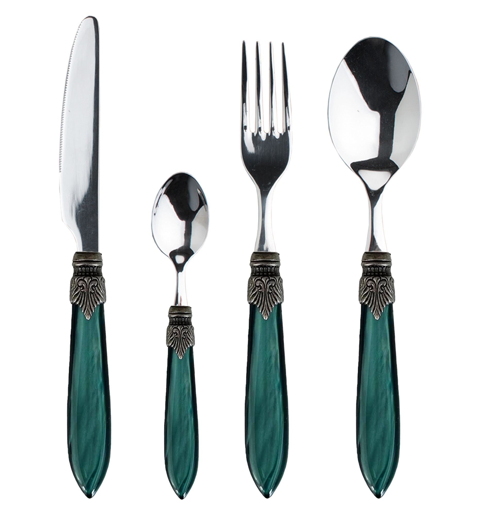 Le service de 4 pièces est pour 1 personne et se compose de 1 couteau à dîner, 1 fourchette à dîner, 1 cuillère à soupe et 1 cuillère à dessert. Chaque pièce est composée d'une lame en acier inoxydable, d'un manche en plastique et d'un ornement en aluminium. Les matériaux sont de très bonne qualité. La lame a une épaisseur de 2,0 mm, ne se plie pas et est en acier inoxydable 18/10. Le manche est en acrylique, un plastique solide avec un effet nacré légèrement brillant. La couleur ne s'efface pas car elle est appliquée dans la masse (au lieu d'une fine couche sur la surface). Le couteau a une fine denture. Il reste donc tranchant et coupe bien. Les couverts sont adaptés au lave-vaisselle et nous vous recommandons de les laver à une température maximale de 55 ° C.