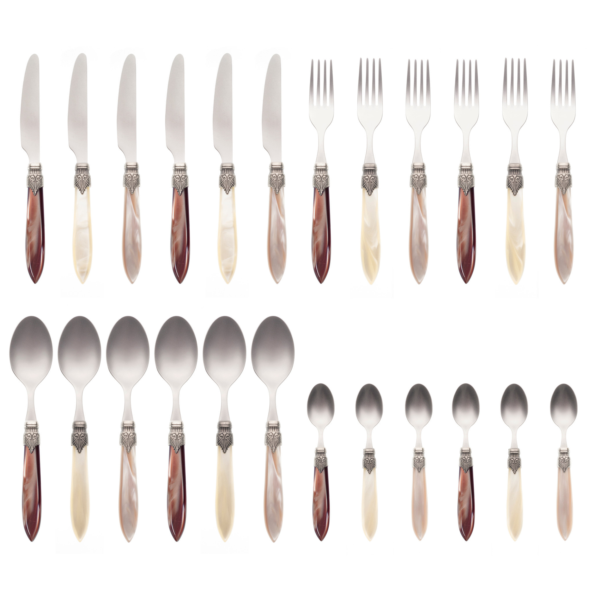 Le service de 24 pièces est pour 6 personnes et se compose de 6 couteaux à dîner, 6 fourchettes à dîner, 6 cuillères à soupe et 6 cuillères à dessert. Chaque pièce est composée d'une lame en acier inoxydable, d'un manche en plastique et d'un ornement en aluminium. Les matériaux sont de très bonne qualité. La lame a une épaisseur de 2,0 mm, ne se plie pas et est en acier inoxydable 18/10. Le manche est en acrylique, un plastique solide avec un effet nacré légèrement brillant. La couleur ne s'efface pas car elle est appliquée dans la masse (au lieu d'une fine couche sur la surface).
