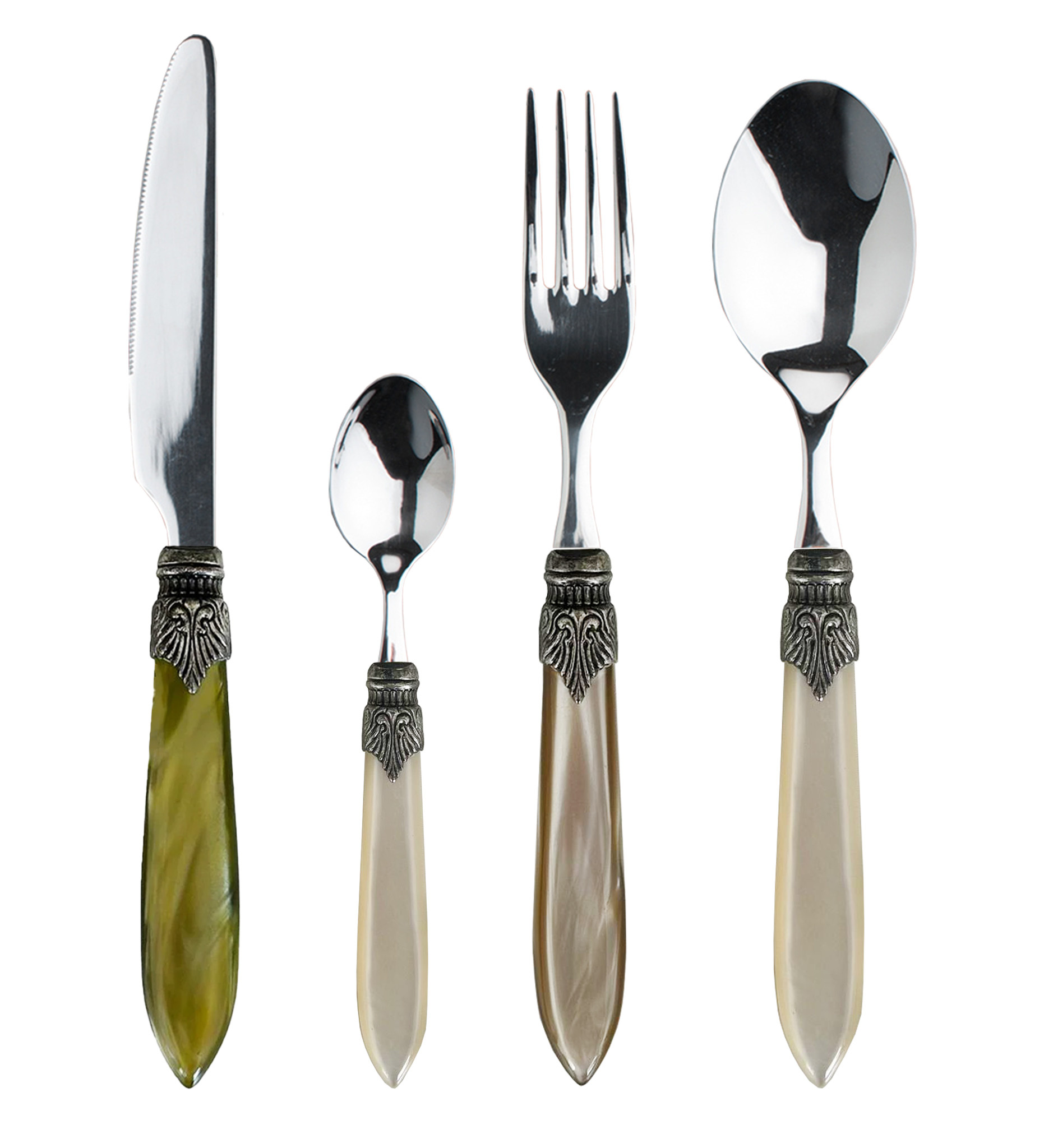 Le service de 24 pièces est pour 6 personnes et se compose de 6 couteaux à dîner, 6 fourchettes à dîner, 6 cuillères à soupe et 6 cuillères à dessert. Chaque pièce est composée d'une lame en acier inoxydable, d'un manche en plastique et d'un ornement en aluminium. Les matériaux sont de très bonne qualité. La lame a une épaisseur de 2,0 mm, ne se plie pas et est en acier inoxydable 18/10. Le manche est en acrylique, un plastique solide avec un effet nacré légèrement brillant. La couleur ne s'efface pas car elle est appliquée dans la masse (au lieu d'une fine couche sur la surface).