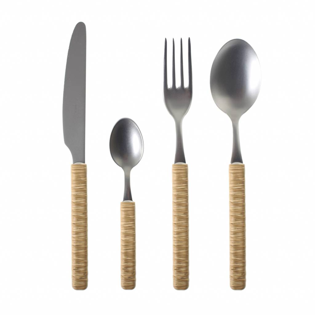 Ce set comprend 6 cuillères, 6 fourchettes, 6 couteaux, 6 cuillères à dessert et un coffret à couverts en bois. Compatible lave-vaisselle jusqu'à 65 °C. Fabrication italienne. Acier inoxydable 18/10.