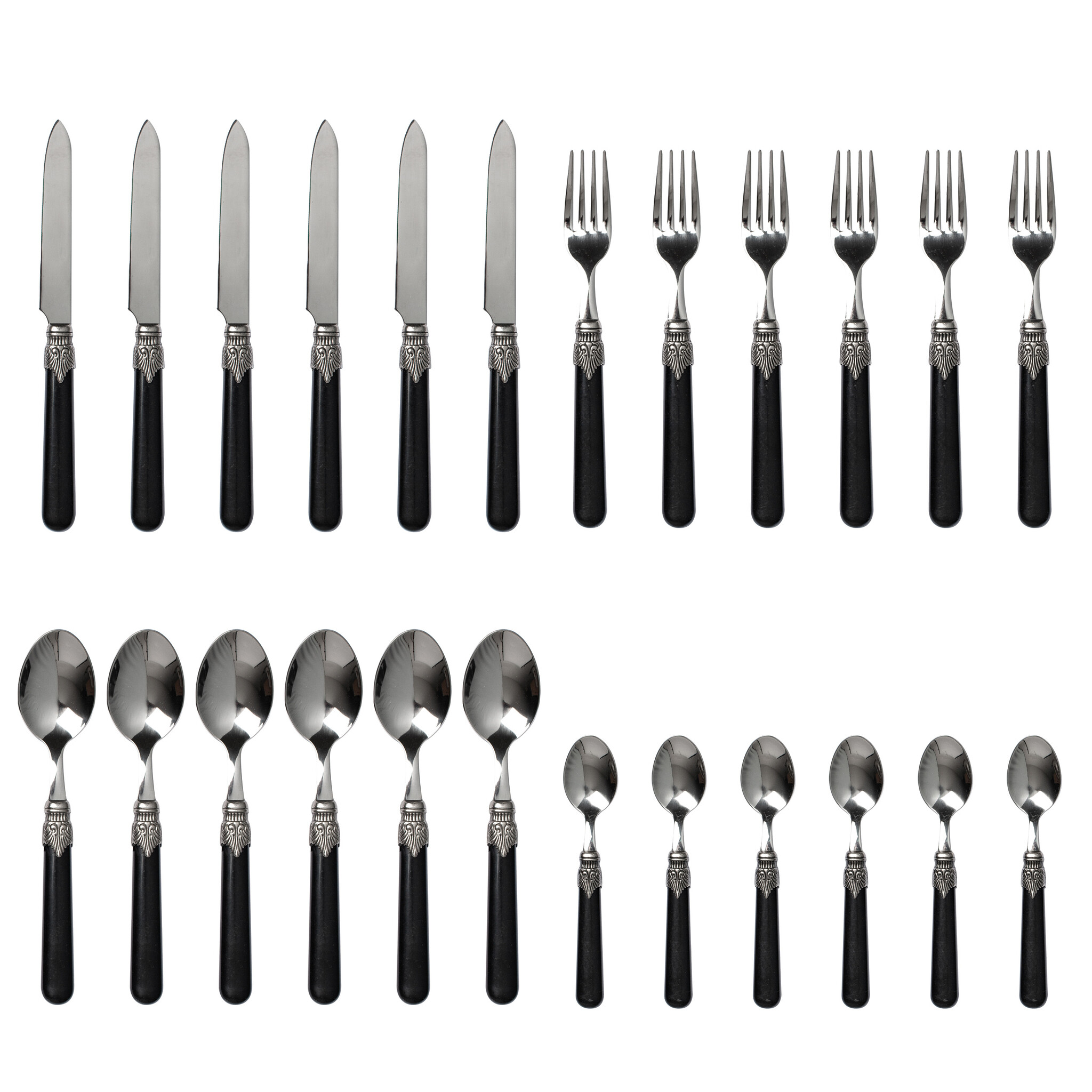 Le service de 24 pièces est pour 6 personnes et se compose de 6 couteaux de table, 6 fourchettes de table, 6 cuillères de table et 6 cuillères à dessert. Chaque couvert est composé d'une lame en acier inoxydable, d'un manche en plastique et d'un ornement en aluminium au milieu. Les matériaux sont de très bonne qualité. La lame a une épaisseur de 1,5 mm, ne se plie pas et est en acier inoxydable 18/10. La poignée est en plastique. La couleur ne s'estompera pas car elle est appliquée sur tout le manche (et non sous forme d'une fine couche sur la surface).