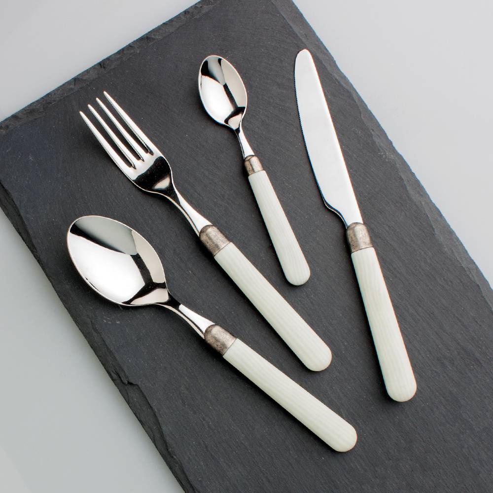 - Messen: Gemaakt van AISI 420 roestvrij staal voor de messen en AISI 430 roestvrij staal voor de vorken en lepels, met fijne karteling op de messen voor precieze sneden en langdurige scherpte.