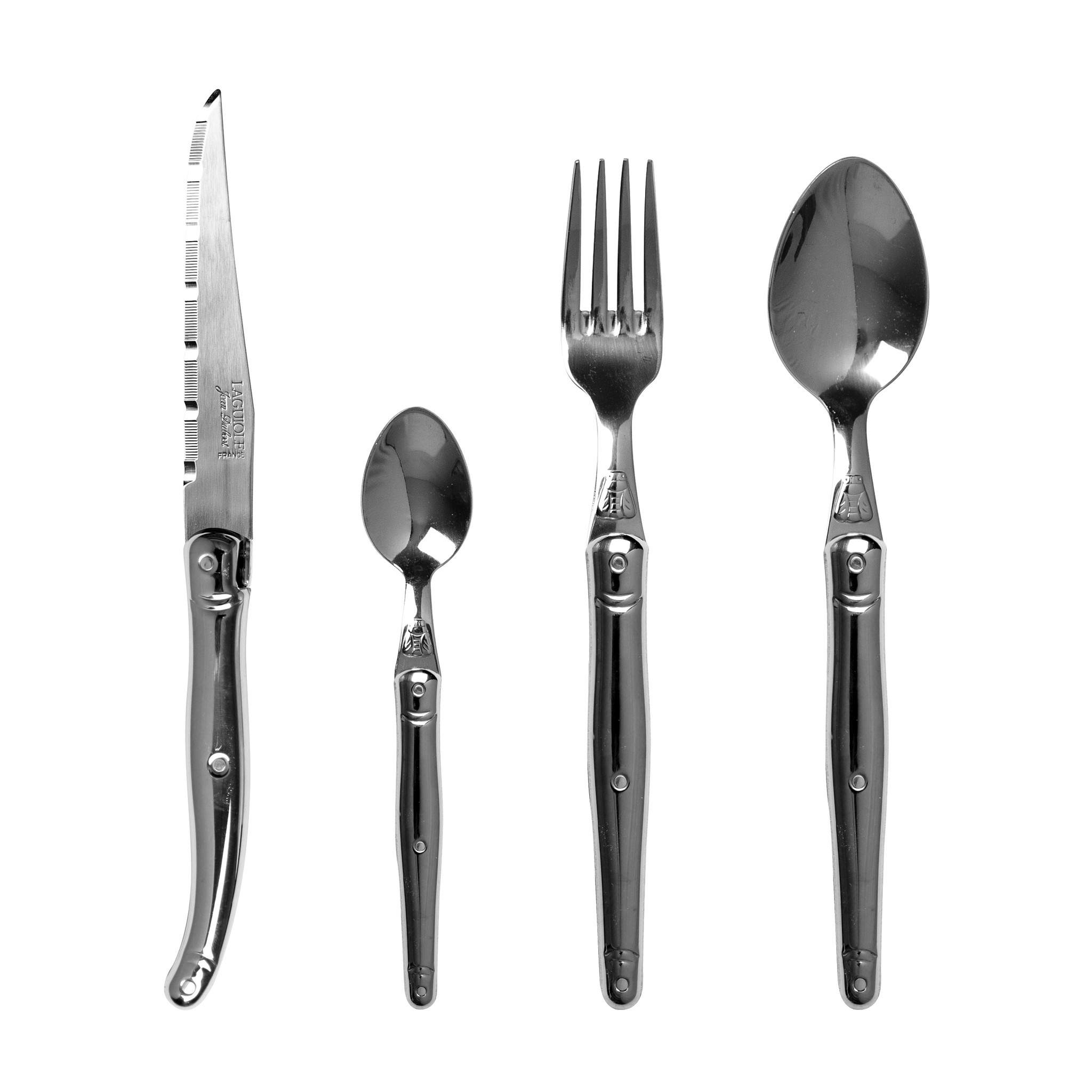 Deze 24-delige Laguiole bestekset in roestvrijstaal uitvoering wordt gemaakt in het honderd jaar oude Franse familiebedrijf Jean Dubost. Dit tijdloze bestek heeft een klassieke uitstraling en bestaat uit 6 steakmessen, 6 dinervorken, 6 dinerlepels en 6 dessertlepeltjes. Het stijlvolle en solide steakmes ligt erg goed in de hand en heeft een staaldikte van 1,2 mm. De andere artikelen zijn ook degelijk uitgevoerd en hebben een staaldikte van 1,5 mm. De binnenkern van het heft is gemaakt van een sterke, duurzame kunststof (PMMA). De mantel van het heft is van roestvrijstaal. Het roestvrijstalen lemmet van het steakmes is gekarteld en uitstekend geschikt voor het snijden van steaks, lamsvlees, pizza’s, wild en rollades. De bestekset is volledig geproduceerd in Frankrijk en voorzien van een echtheidscertificaat. De set wordt in een mooi afgewerkte houten bestekkist van Europees naaldhout geleverd. De stevige bestekkist is niet alleen een leuke cadeauverpakking maar ook zeer geschikt om het bestek in op te bergen.