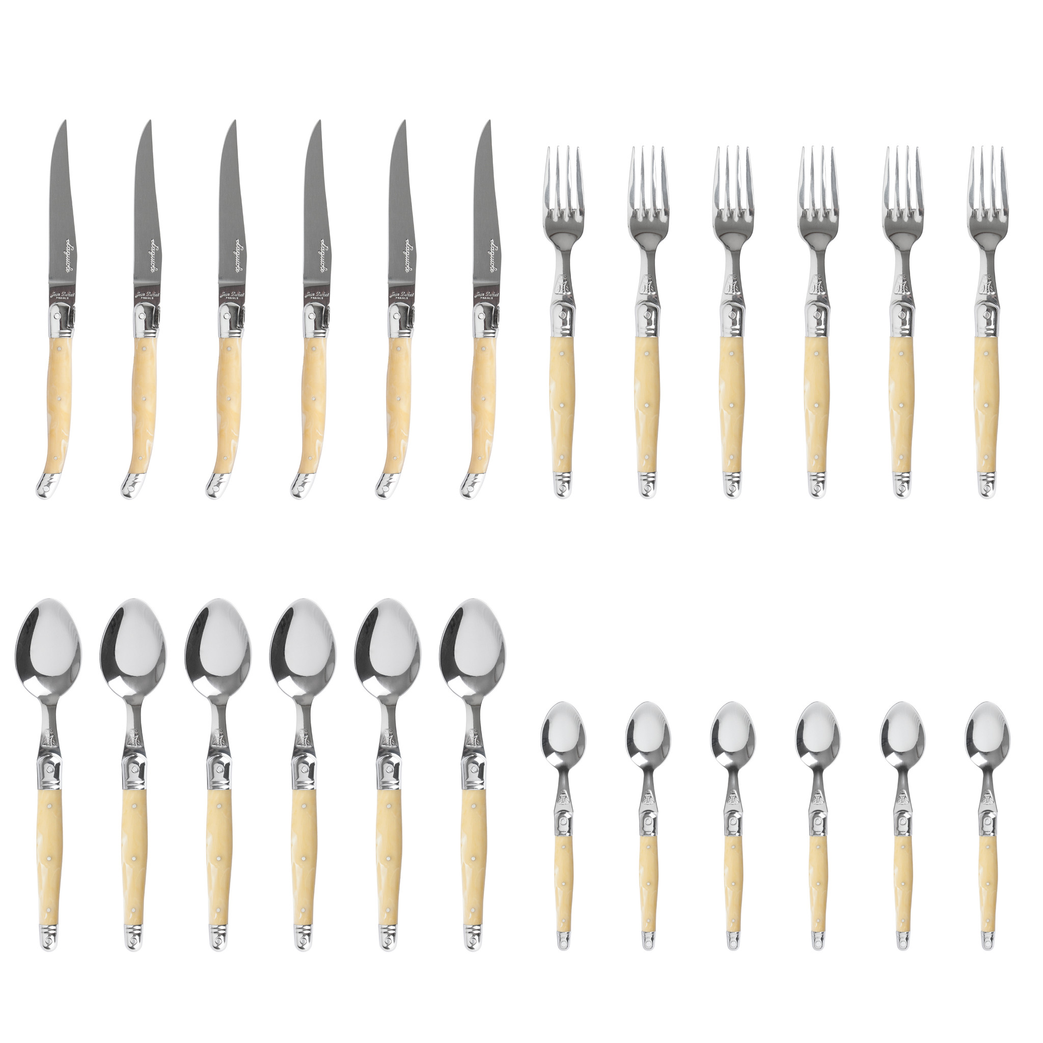 Deze 24-delige ivoorkleurige Laguiole bestekset wordt gemaakt in het honderd jaar oude Franse familiebedrijf Jean Dubost. Dit tijdloze bestek heeft een klassieke uitstraling en bestaat uit 6 steakmessen, 6 dinervorken, 6 dinerlepels en 6 dessertlepeltjes. Het stijlvolle en solide steakmes ligt erg goed in de hand en heeft een staaldikte van 1,5 mm. De andere artikelen zijn ook degelijk uitgevoerd en hebben eveneens een staaldikte van 1,5 mm. Het heft is gemaakt van een sterke, duurzame kunststof (PMMA). Het roestvrijstalen lemmet van het steakmes is glad geslepen en uitstekend geschikt voor het snijden van steaks, lamsvlees, pizza’s, wild en rollades. De bestekset is volledig geproduceerd in Frankrijk en voorzien van een echtheidscertificaat. De set wordt in een mooi afgewerkte afsluitbare houten bestekkist van Europees populierenhout geleverd. De mooi uitgevoerde bestekkist is niet alleen een luxe cadeauverpakking maar ook zeer geschikt om het bestek in op te bergen.
