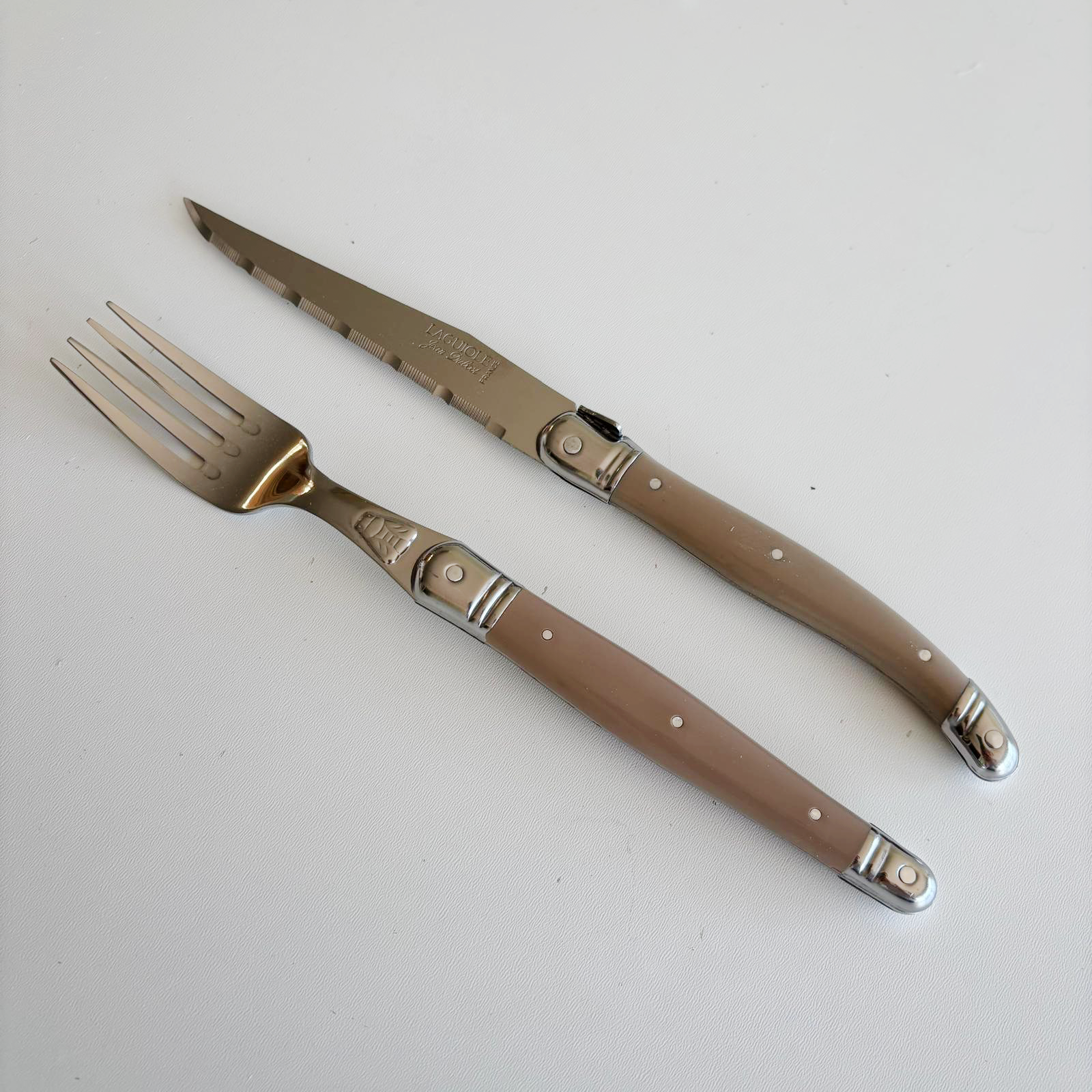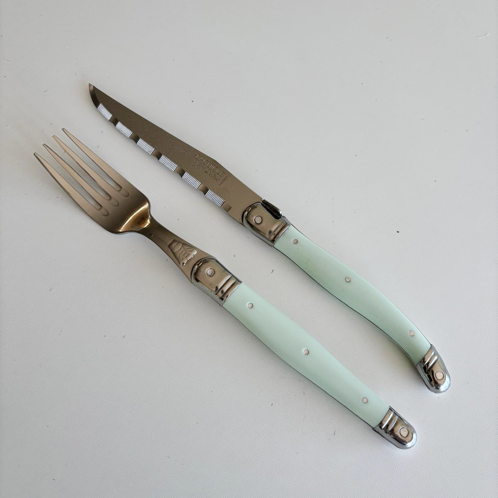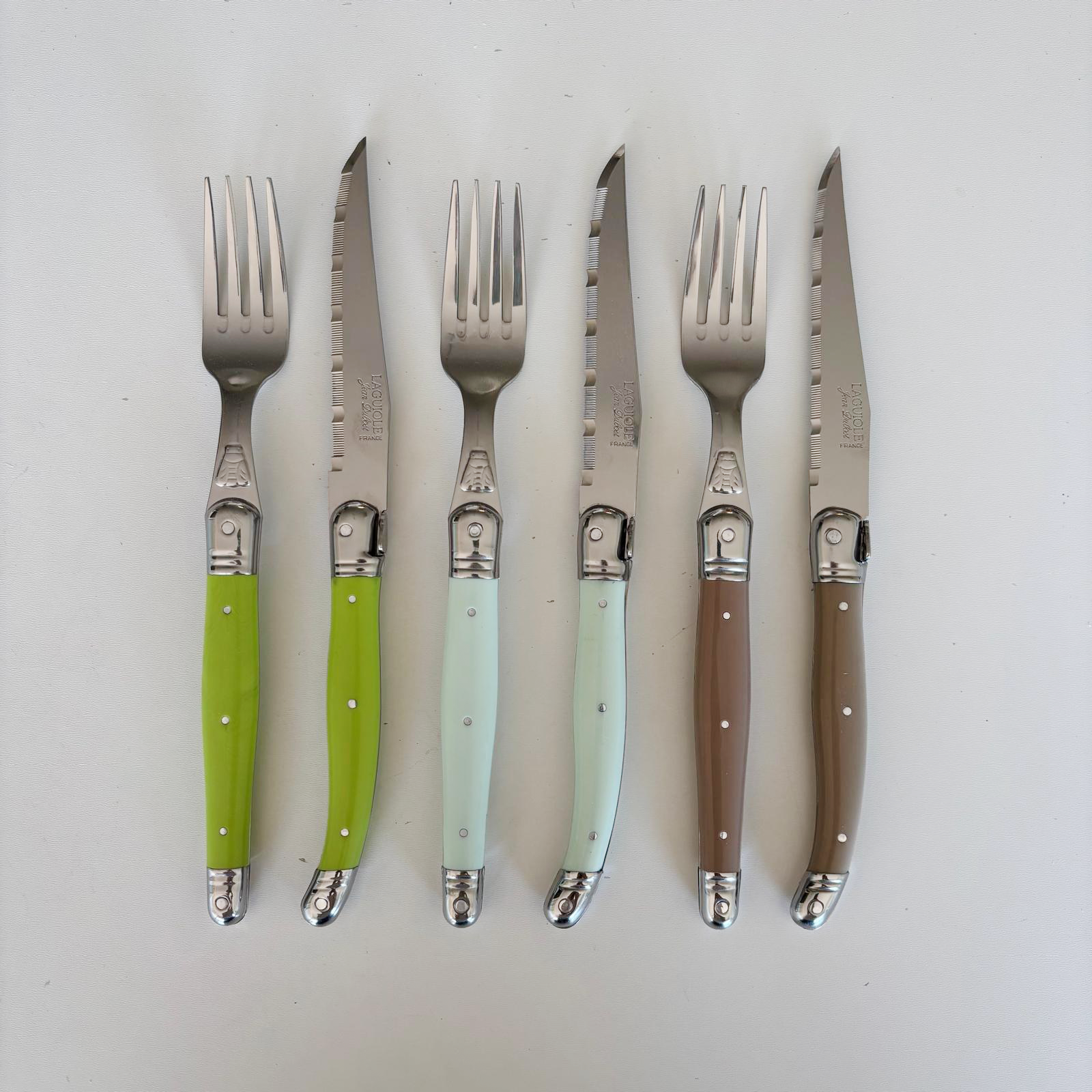 Deze 12-delige Laguiole bestekset wordt gemaakt in het honderd jaar oude Franse familiebedrijf Jean Dubost. De vlijmscherpe, stijlvolle en solide messen liggen erg goed in de hand en hebben een staaldikte van 1,2 mm. De bijbehorende vorken hebben een staaldikte van 1,5 mm. Het heft is gemaakt van acrylaat (PMMA) een sterke kunststof. De kleur zal er niet afslijten omdat deze door het hele heft is aangebracht. Het roestvrijstalen steakmes lemmet is gekarteld en uitstekend geschikt voor het snijden van steaks, lamsvlees, barbecue gerechten, pizza's, wild en rollades. De set is volledig geproduceerd in Frankrijk en verpakt in een kistje van hout, voorzien van echtheidscertificaat. De messen en vorken kunnen zonder problemen in de vaatwasmachine hoewel sommige gebruikers bij voorkeur de messen met de hand wassen omdat ze dan langer scherp zouden blijven. Het ideale geschenk voor thuiskoks en culinaire liefhebbers!