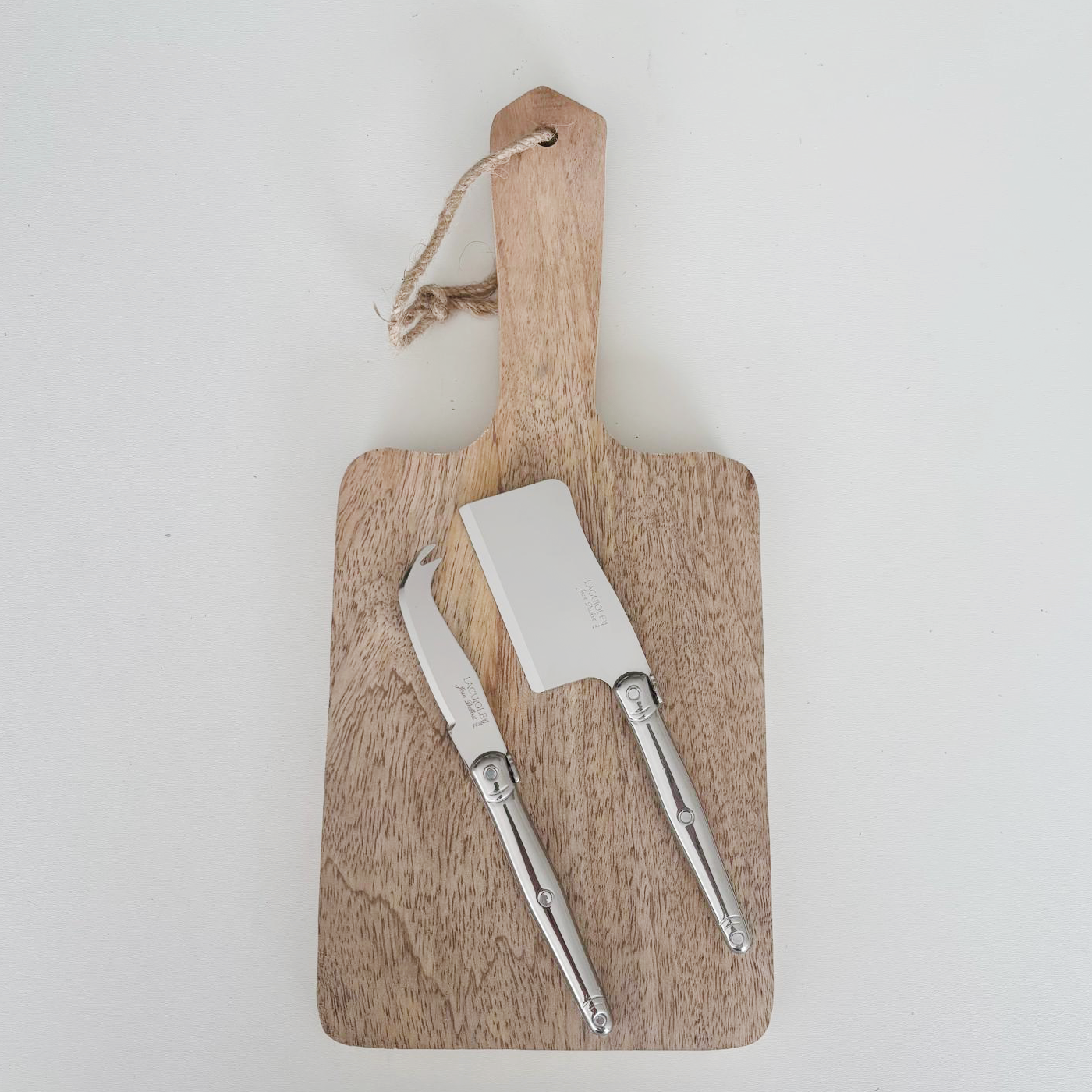 - Snijplank van mango hout met ophangtouw en 2 originele Laguiole kaasmesjes