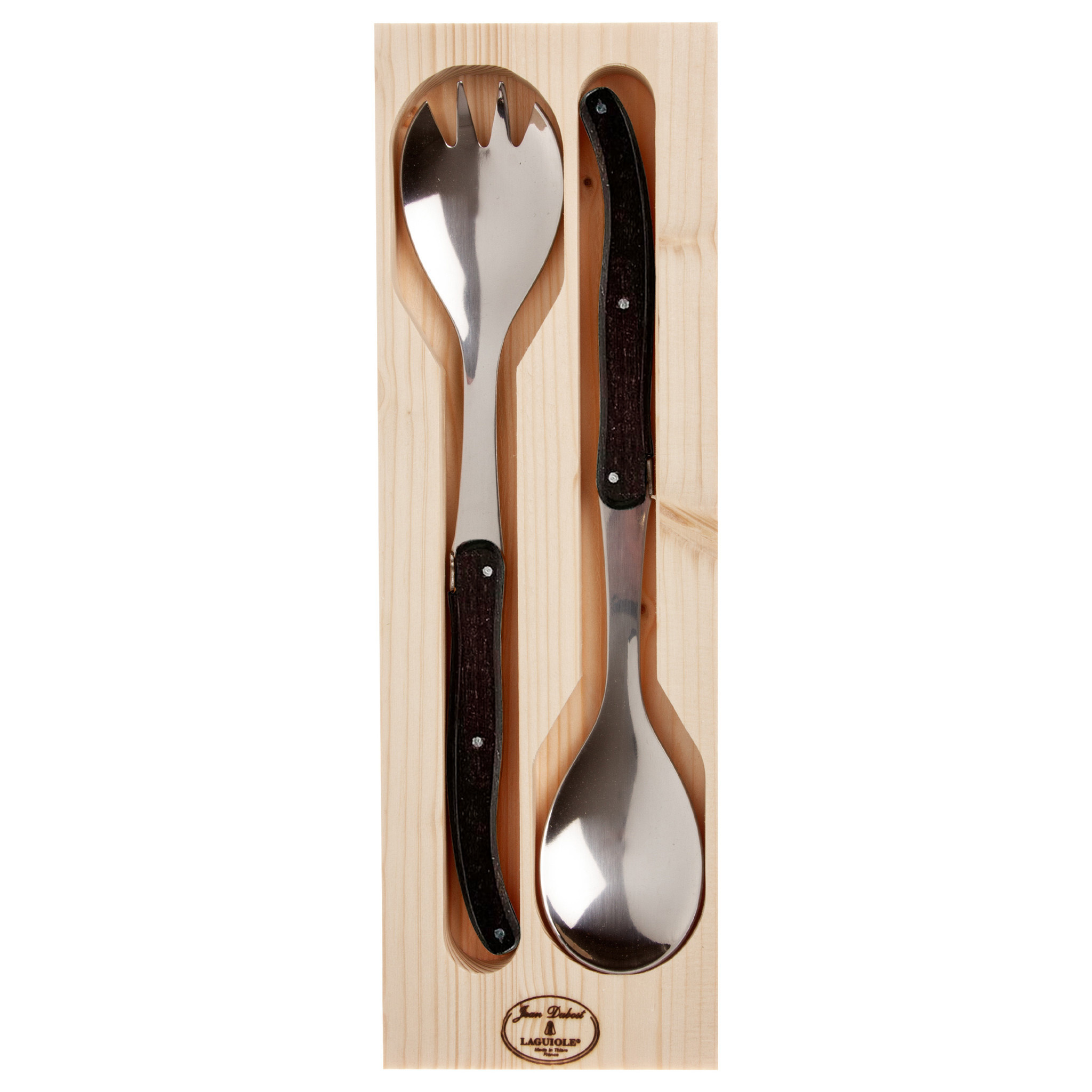 Het merk Laguiole is van oudsher bekend vanwege de steakmessen. Tegenwoordig zijn er talrijke andere artikelen verkrijgbaar, zoals dit stijlvolle slacouvert van eikenhout. Dit slacouvert heeft uiteraard ook het honingbij-embleem. Het heft is gemaakt van echt wengé hout. De set is volledig geproduceerd in Frankrijk en verpakt in een display van hout en voorzien van echtheidscertificaat. De slavork en slalepel zijn 24,5 cm lang. Het is een prettig in de hand liggend slacouvert dat niet alleen geschikt is voor het serveren van salades maar ook uitstekend kan worden gebruikt voor het opdienen van groenten, aardappels, pastagerechten, ovengerechten en eenpansgerechten. Het slacouvert kan vanwege de houten heften alleen met de hand worden afgewassen. Het ideale geschenk voor thuiskoks en culinaire liefhebbers!