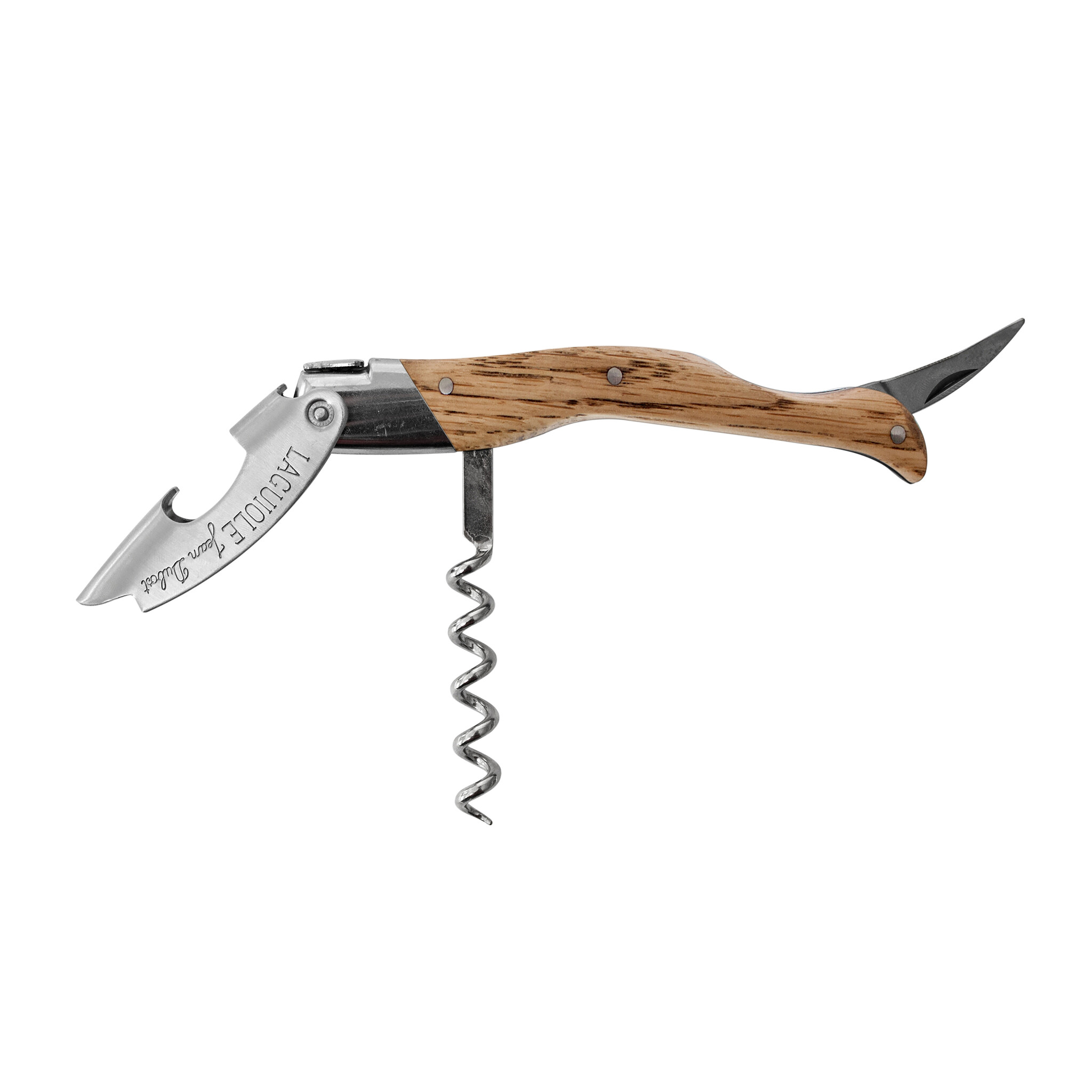Dit inklapbare Laguiole kelnersmes van eikenhout wordt gemaakt in het honderd jaar oude Franse familiebedrijf Jean Dubost. Het tijdloze, klassieke model werd rond 1920 speciaal ontwikkeld voor kelners van de vooraanstaande Parijse cafés. Het is een geliefd gereedschap dat nog steeds uitstekend voldoet en nauwelijks afwijkt van het oorspronkelijke ontwerp. De spiraal is gemaakt van ijzersterk roestvrij windingendraad met een scherpe punt, dat voorkomt dat de kurk verkruimelt of afbreekt. Het handvat fungeert als hefboom en is gemaakt van echt eikenhout. In het handvat zit ook een klein uitklapbaar mesje waarmee de capsule kan worden afgesneden. Het kelnersmes is volledig geproduceerd in Frankrijk en verpakt in een luxe en handig opbergkistje van hout en voorzien van echtheidscertificaat. Vanwege het heft van hout kan het kelnersmes alleen met de hand worden gewassen. Het ideale geschenk voor zowel de professionele sommelier als andere wijnliefhebbers!