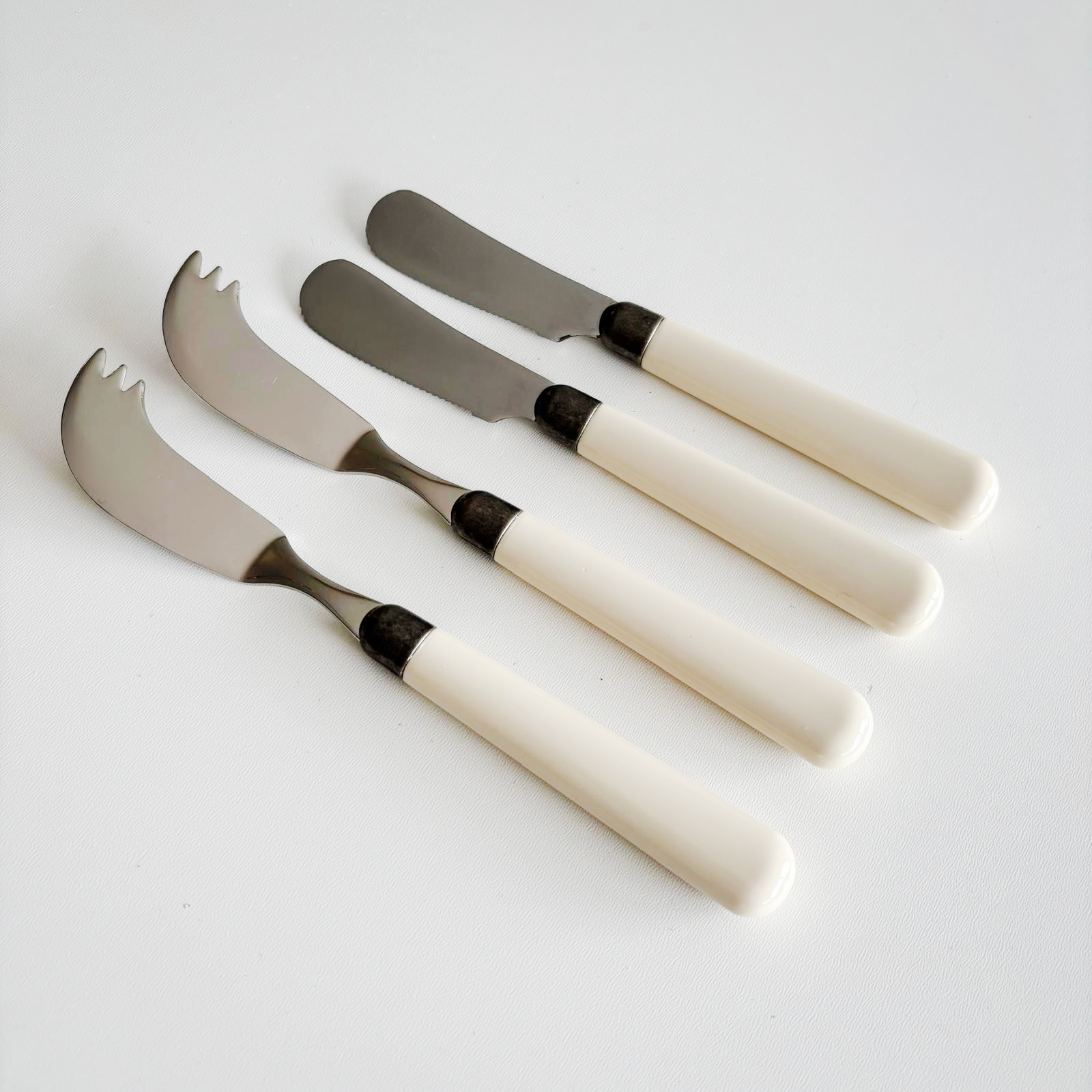 De botermesjes en kaasmesjes hebben een lemmet van roestvrijstaal, een heft van kunststof en in het midden een ornament van aluminium. De materialen zijn van zeer degelijke kwaliteit. Het lemmet is 1,8 mm dik, buigt niet door en is gemaakt van 18/10 roestvrijstaal. Het heft is gemaakt van acrylaat, een sterke kunststof. De kleur zal er niet afslijten omdat deze door het hele heft is aangebracht (en niet als een dunne coating aan het oppervlak).