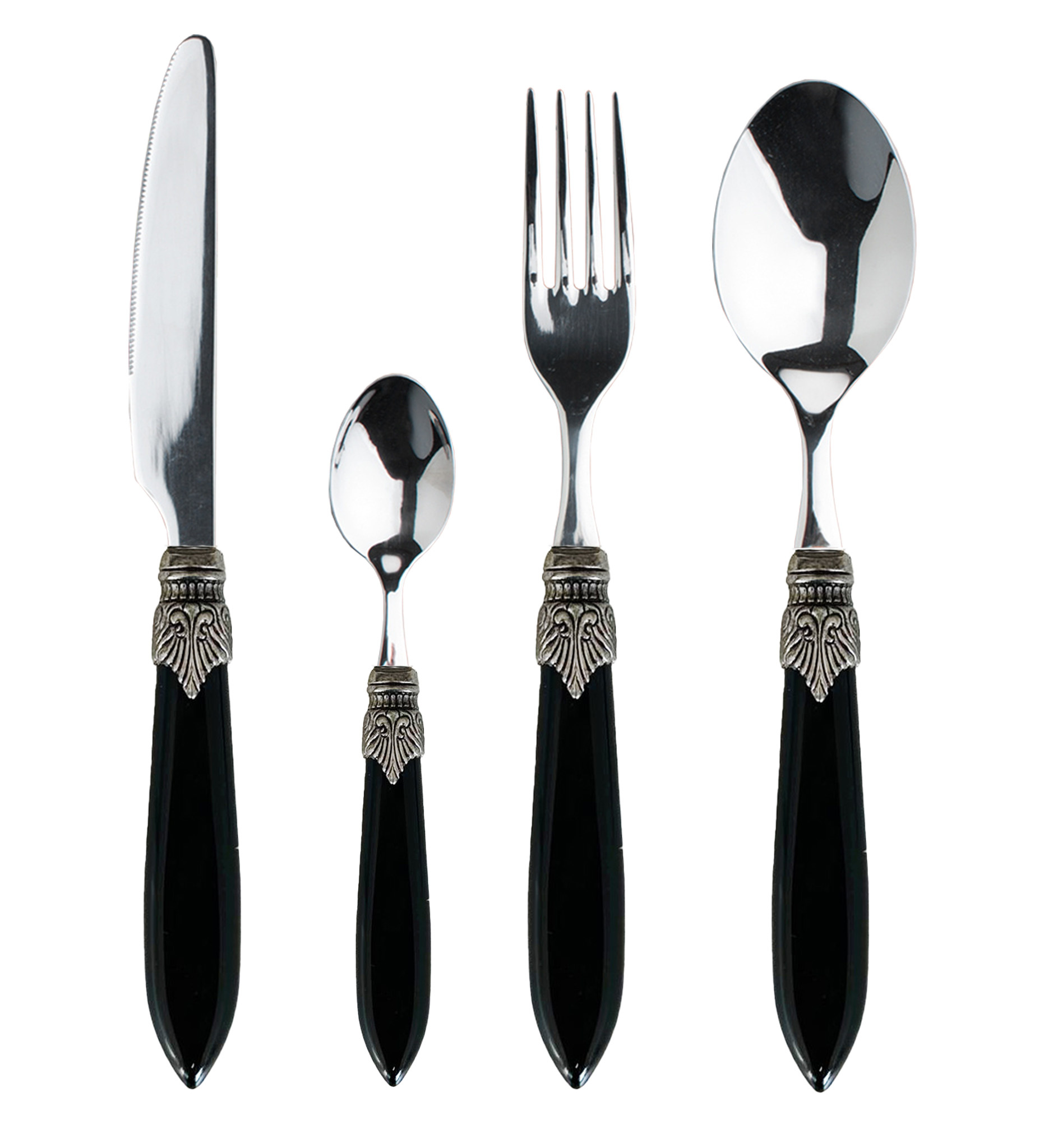 De 4-delige set is voor 1 persoon en bestaat uit 1 dinermes, 1 dinervork, 1 dinerlepel en 1 dessertlepeltje. Elk bestekonderdeel is samengesteld uit een lemmet van roestvrijstaal, een heft van kunststof en in het midden een ornament van aluminium. De materialen zijn van zeer degelijke kwaliteit. Het lemmet is 2,0 mm dik, buigt niet door en is gemaakt van 18/10 roestvrijstaal. Het heft is gemaakt van acrylaat, een sterke kunststof met een effen glanzend effect. De kleur zal er niet afslijten omdat deze door het hele heft is aangebracht (en niet als een dunne coating aan het oppervlak). Het mes heeft een fijne karteling. Het blijft daardoor scherp en snijdt goed. Het bestek is geschikt voor de vaatwasmachine waarbij wij adviseren om het op een temperatuur van maximaal 55˚ C te wassen.