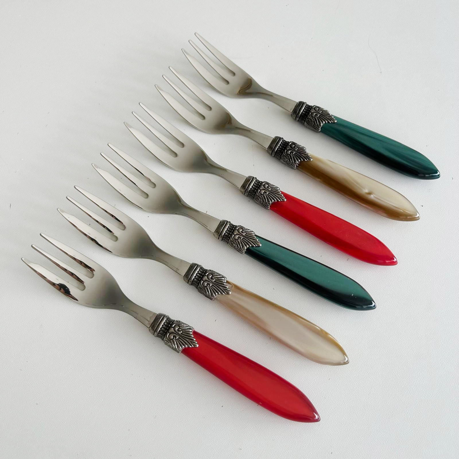 Het taartvorkje heeft een lemmet van roestvrijstaal, een heft van kunststof en in het midden een ornament van aluminium. De materialen zijn van zeer degelijke kwaliteit. Het lemmet is 1,5 mm dik, buigt niet door en is gemaakt van 18/10 roestvrijstaal. Het heft is gemaakt van acrylaat, een sterke kunststof met een licht glanzend parelmoer effect. De kleur zal er niet afslijten omdat deze door het hele heft is aangebracht (en niet als een dunne coating aan het oppervlak).