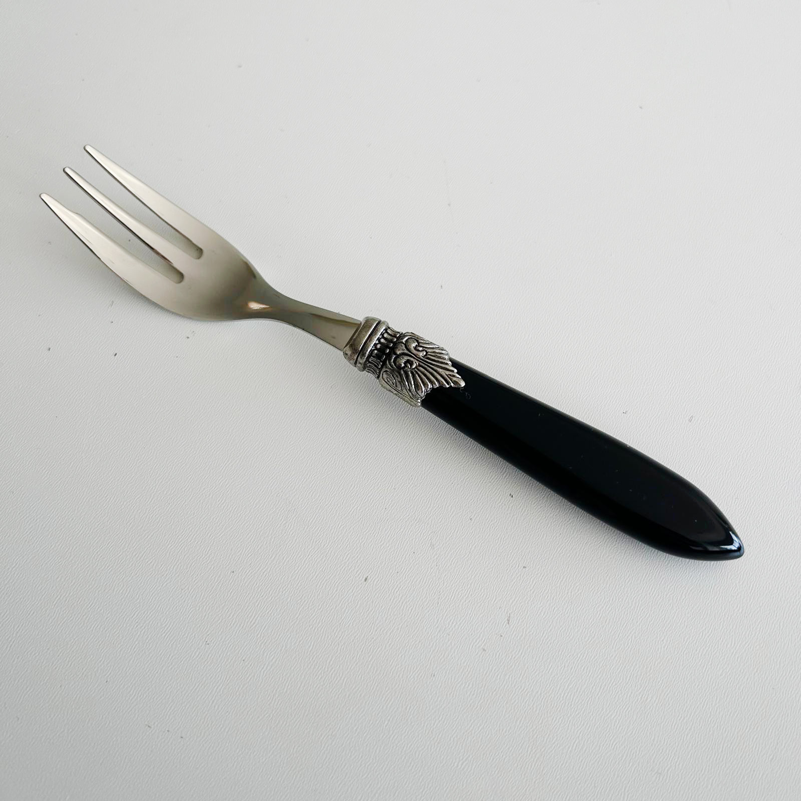 Het taartvorkje heeft een lemmet van roestvrijstaal, een heft van kunststof en in het midden een ornament van aluminium. De materialen zijn van zeer degelijke kwaliteit. Het lemmet is 1,5 mm dik, buigt niet door en is gemaakt van 18/10 roestvrijstaal. Het heft is gemaakt van acrylaat, een sterke kunststof met een licht glanzend effen effect. De kleur zal er niet afslijten omdat deze door het hele heft is aangebracht (en niet als een dunne coating aan het oppervlak).