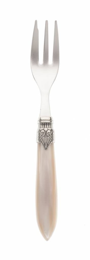Het taartvorkje heeft een lemmet van roestvrijstaal, een heft van kunststof en in het midden een ornament van aluminium. De materialen zijn van zeer degelijke kwaliteit. Het lemmet is 1,5 mm dik, buigt niet door en is gemaakt van 18/10 roestvrijstaal. Het heft is gemaakt van acrylaat, een sterke kunststof met een licht glanzend parelmoer effect. De kleur zal er niet afslijten omdat deze door het hele heft is aangebracht (en niet als een dunne coating aan het oppervlak).