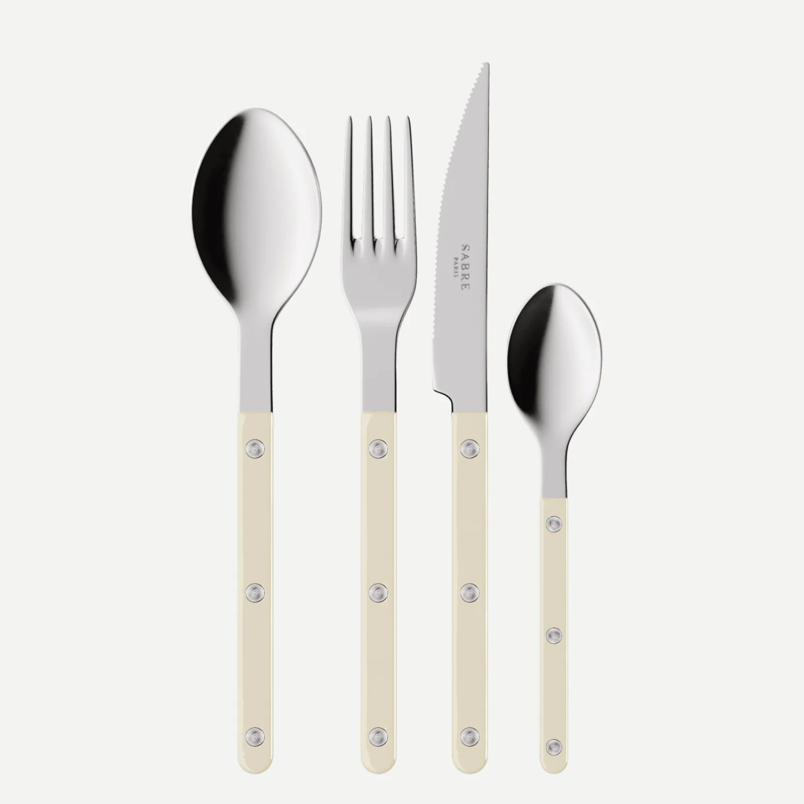 Een van de bekendste lijnen is Bistrot, geïnspireerd op de sfeer van Parijse cafés, restaurants en terrassen. Het bestek heeft een herkenbare, tijdloze uitstraling: zichtbaar geklonken handvatten, een eenvoudige vormgeving, en een rijke keuze aan kleuren en materialen. Deze 24-delige set wordt bij ons aangeboden in drie uitvoeringen: ivoor, zwart en teak hout.