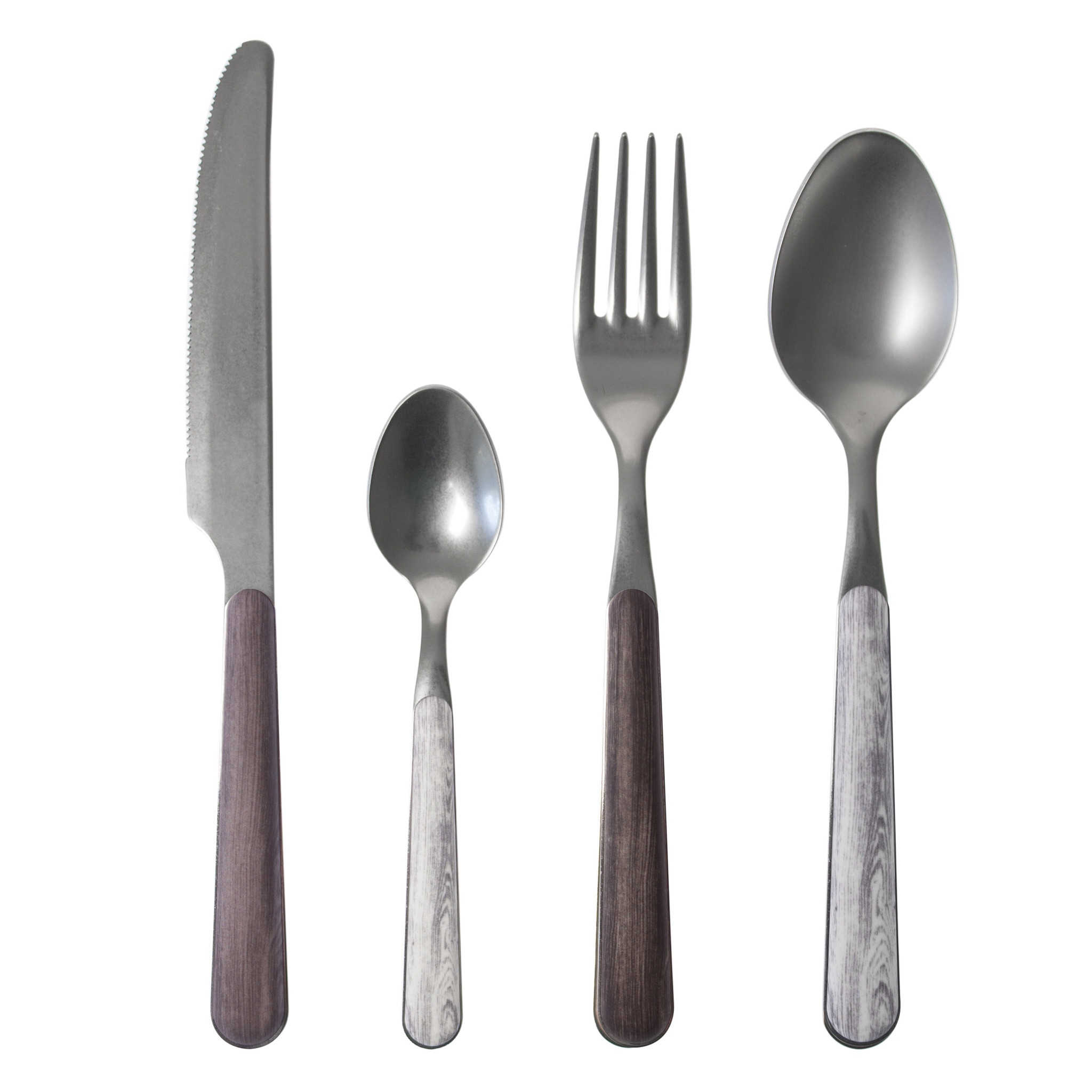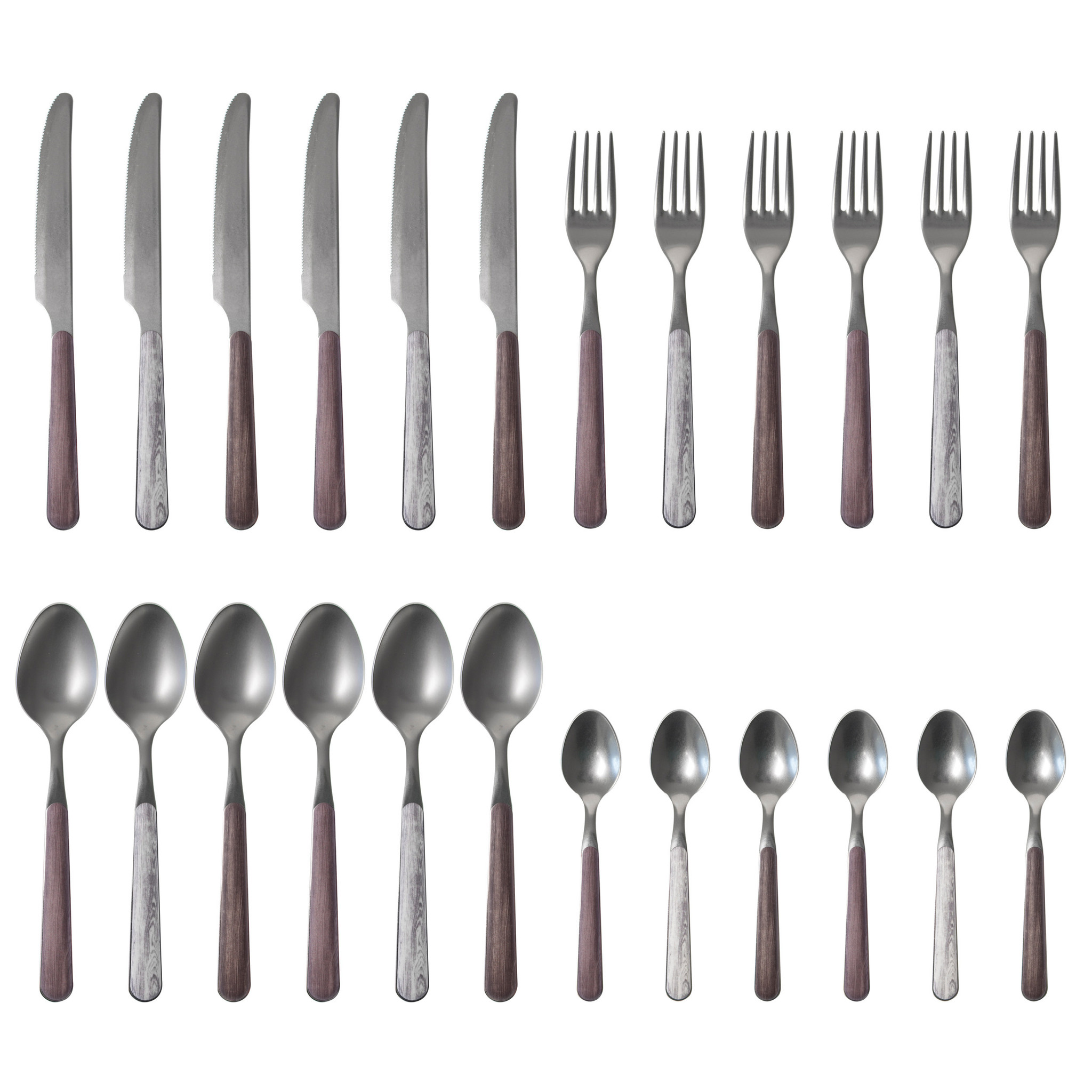 Deze 24-delige Wood Style bestekset in 'Glacier Mix' houtkleuren wordt in Italië gemaakt. De set is samengesteld uit 3 verschillende houtsoorten en bestaat uit 6 dinermessen, 6 dinervorken, 6 dinerlepels en 6 dessertlepeltjes. De materialen zijn van uitstekende kwaliteit. Het lemmet bestaat over de gehele lengte uit één stuk en buigt niet door. Verder heeft het een dikte van 1,8 mm en is het gemaakt van roestvrijstaal. Het heft is niet van hout gemaakt, maar van een vrijwel niet van echt hout te onderscheiden sterke kunststof. Daarnaast is het heft zodanig behandeld waardoor het als echt hout aanvoelt en niet als een gladde kunststof. Het houtpatroon is met een speciale techniek aangebracht en zal niet vervagen. Het grote voordeel van dit bestek is dat het in tegenstelling tot echt hout probleemloos in de vaatwasmachine kan. De messen zijn voorzien van een fijne karteling waardoor ze prima snijden en lang scherp blijven. De set wordt in een mooi afgewerkte houten bestekkist van Europees naaldhout geleverd. De stevige bestekkist is niet alleen een leuke cadeauverpakking maar ook zeer geschikt om het bestek in op te bergen.